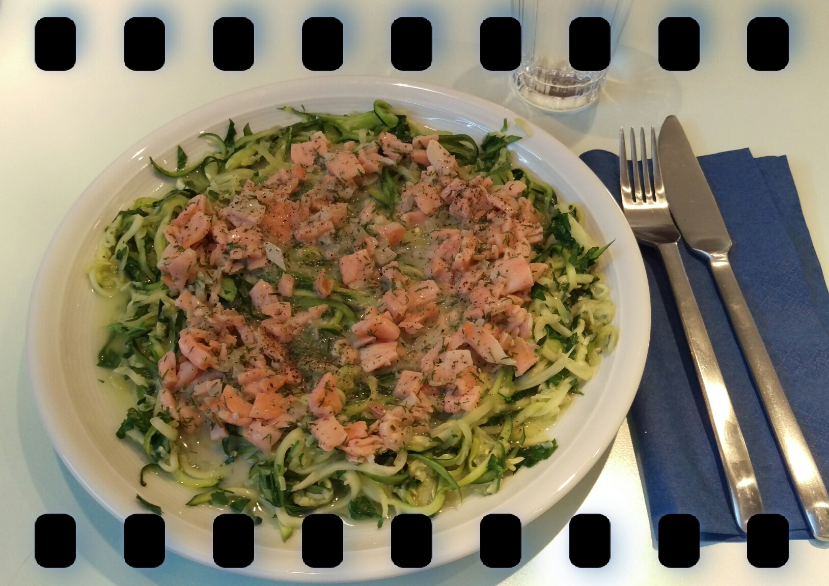 die Zucchini-Spaghetti salzen und mit der glatten Petersilie mischen, auf einem Teller anrichten und die Lachs-Sauce darüber geben