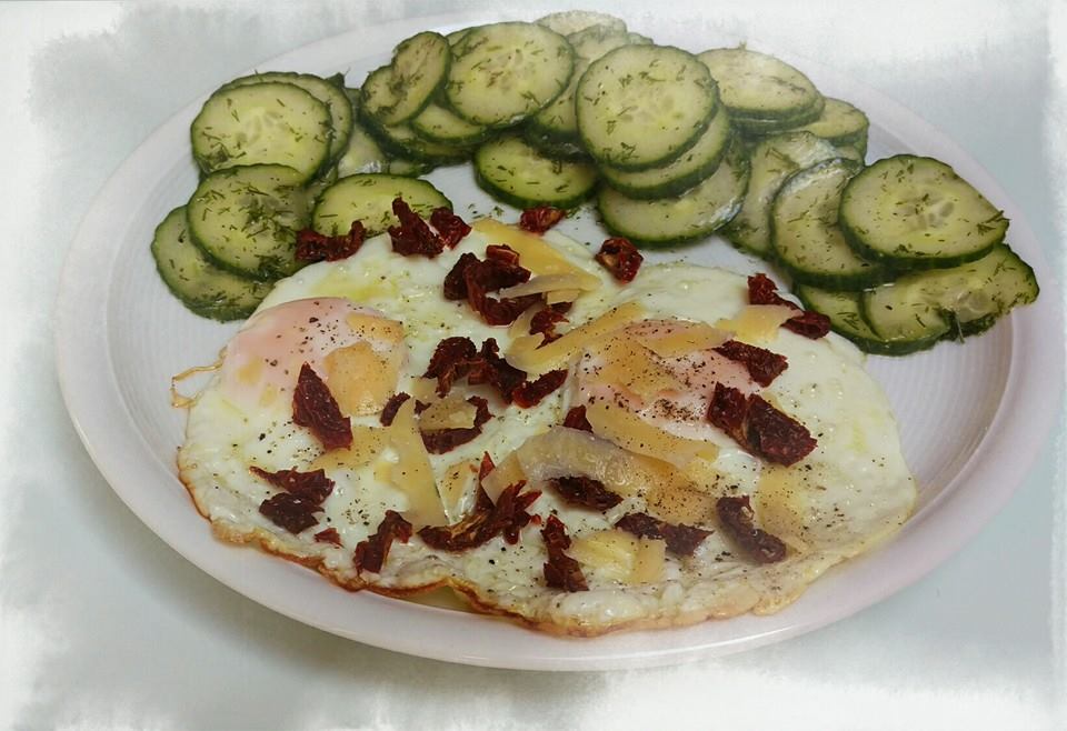 die Eier salzen und pfeffern, mit den getrockneten Tomaten und dem Parmesan bestreuen und zum Gurkensalat servieren