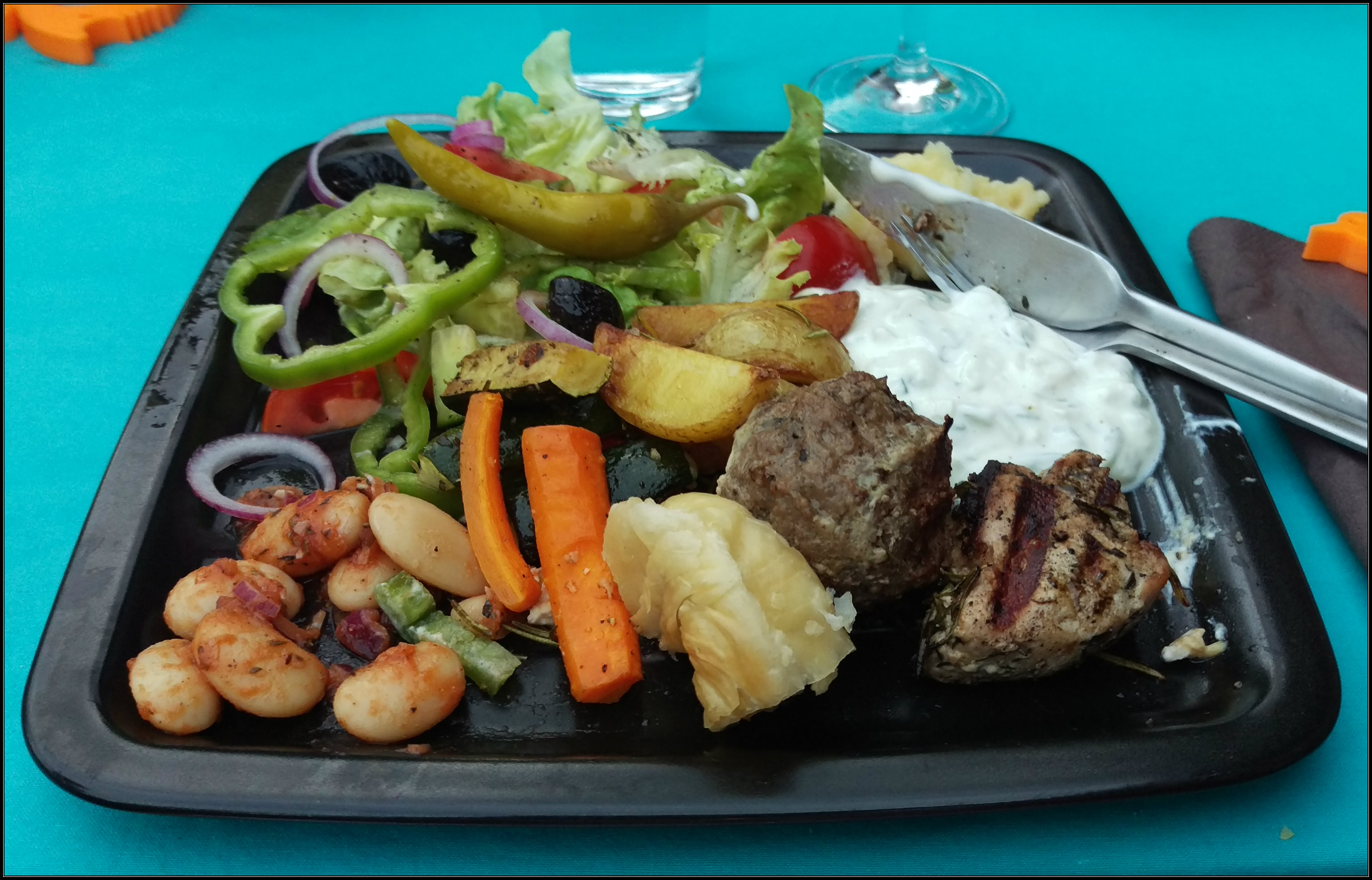 für einen Abend zu sechst (drei Frauen mit üblicherweise weniger Appetit, drei Männer), mit Bohnensalat, Blätterteigschnecke, Bauernsalat, Skordalia, Tzatziki, Ofengemüse, Rosmarinkartoffen, Bifteki, Souvlaki, Wassermelone und ggf. Ouzo und leicht gekühltem trockenen Rotwein