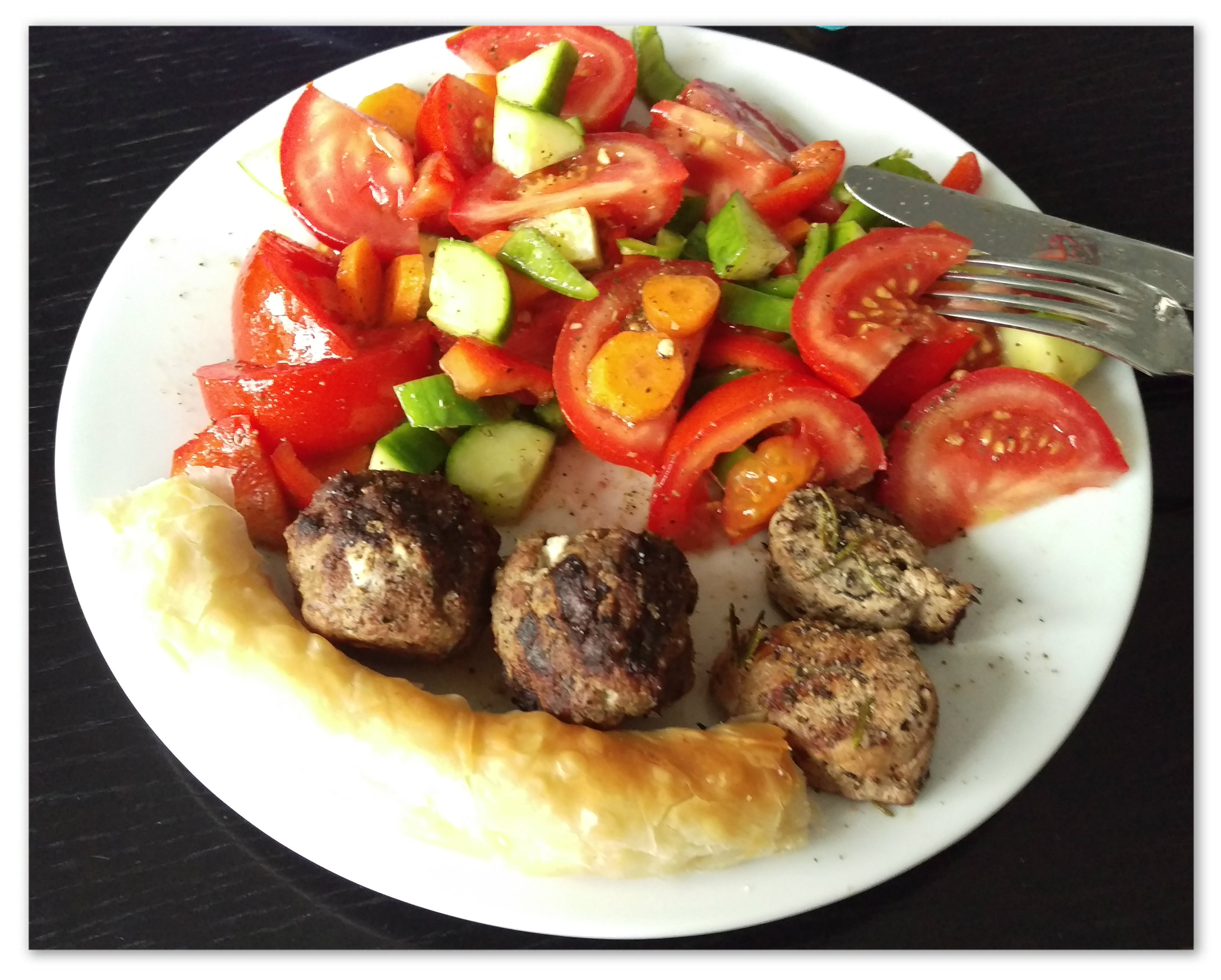 Bifteki, Souvlaki und Blätterteigschnecke in eine Pfanne mit Deckel geben und bei mittlerer Hitze aufwärmen, alternativ geht auch die Microwelle und (nicht zu) kalt schmeckt’s ggf. auch