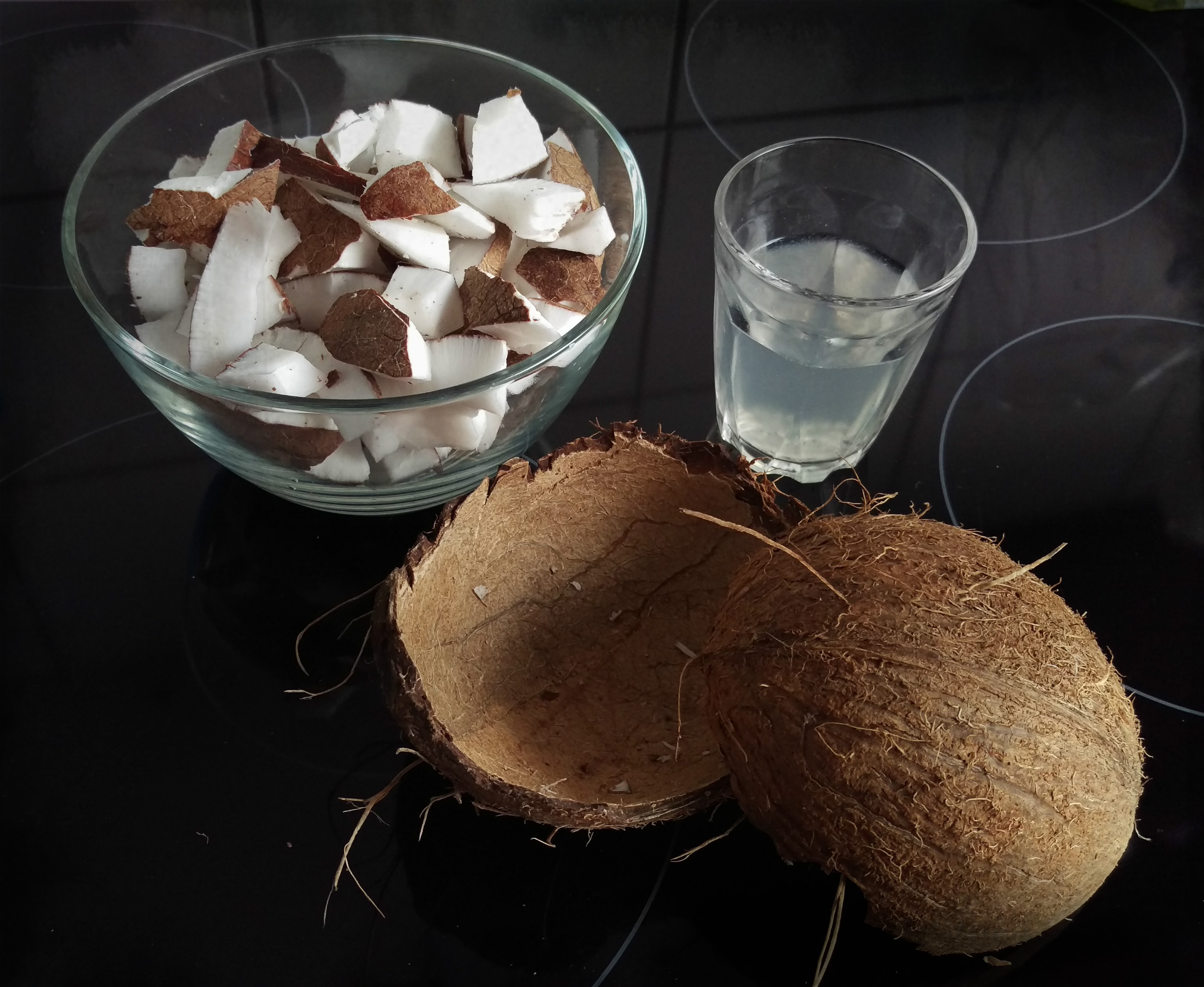 die Kokosnuss mit einem Hammer aufknacken und das Fleisch mit einem Messer aus der Schale schälen, ist super als Snack zwischendurch oder auch als Beigabe zu Joghurt