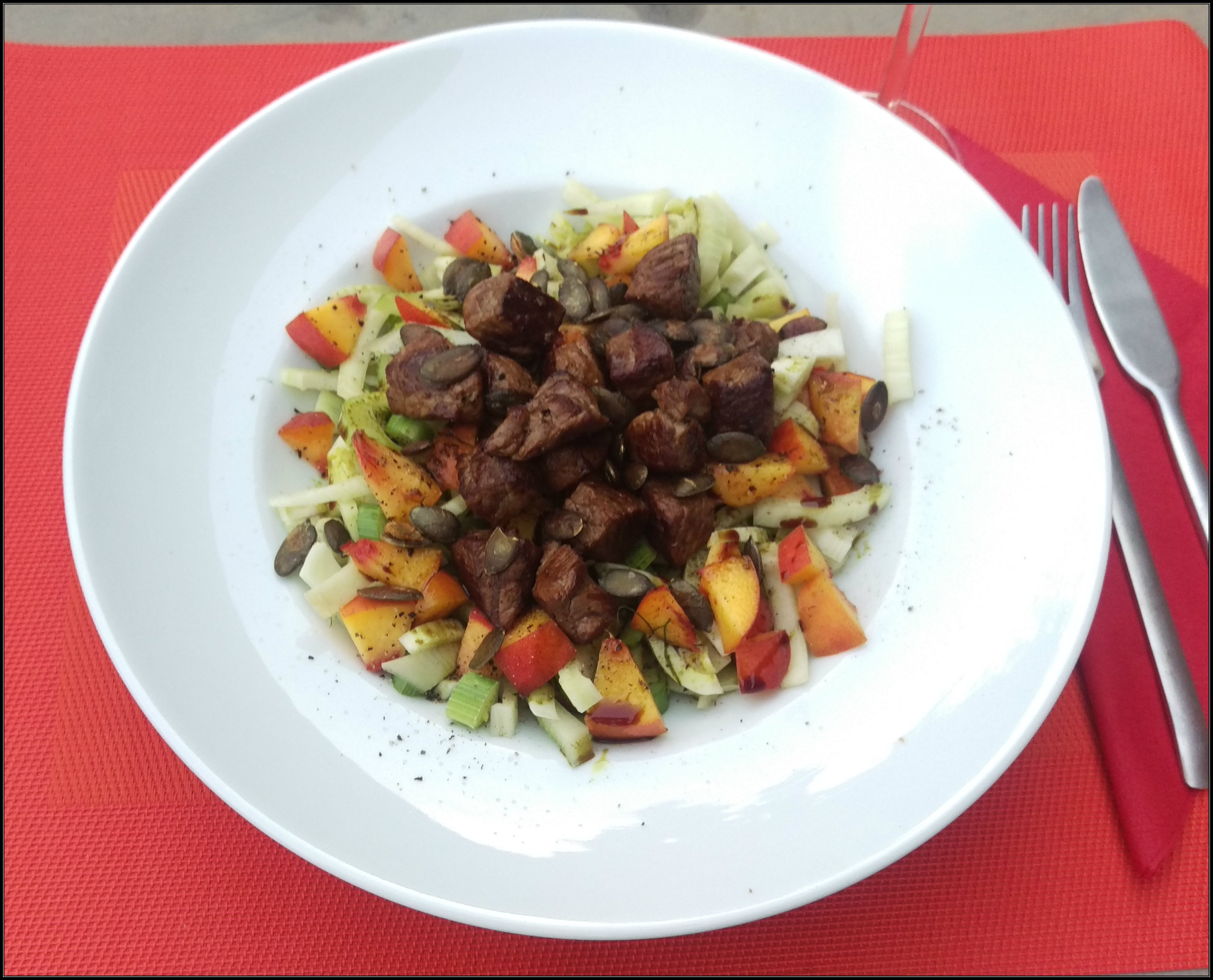 1 Pfirsich in kleine Stücke schneiden und darübergeben, die Hüftsteakstreifen bei mittlerer Hitze fertigbraten (medium, wer es mag, sonst länger) und auf den Salat geben, alles mit Salz und
