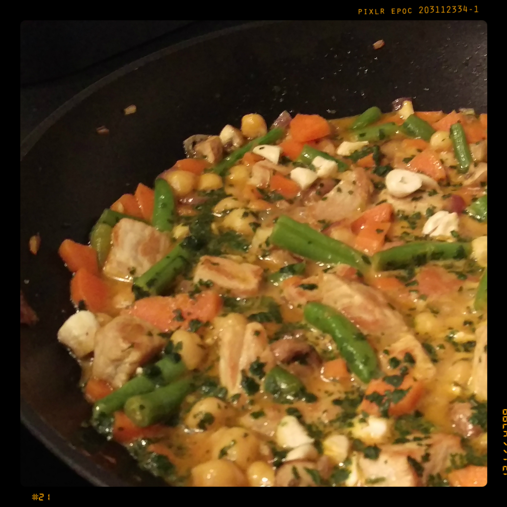 60 Kichererbsen (vorgegart, ggf. aus der Dose), das Fleisch und die Champignons sowie