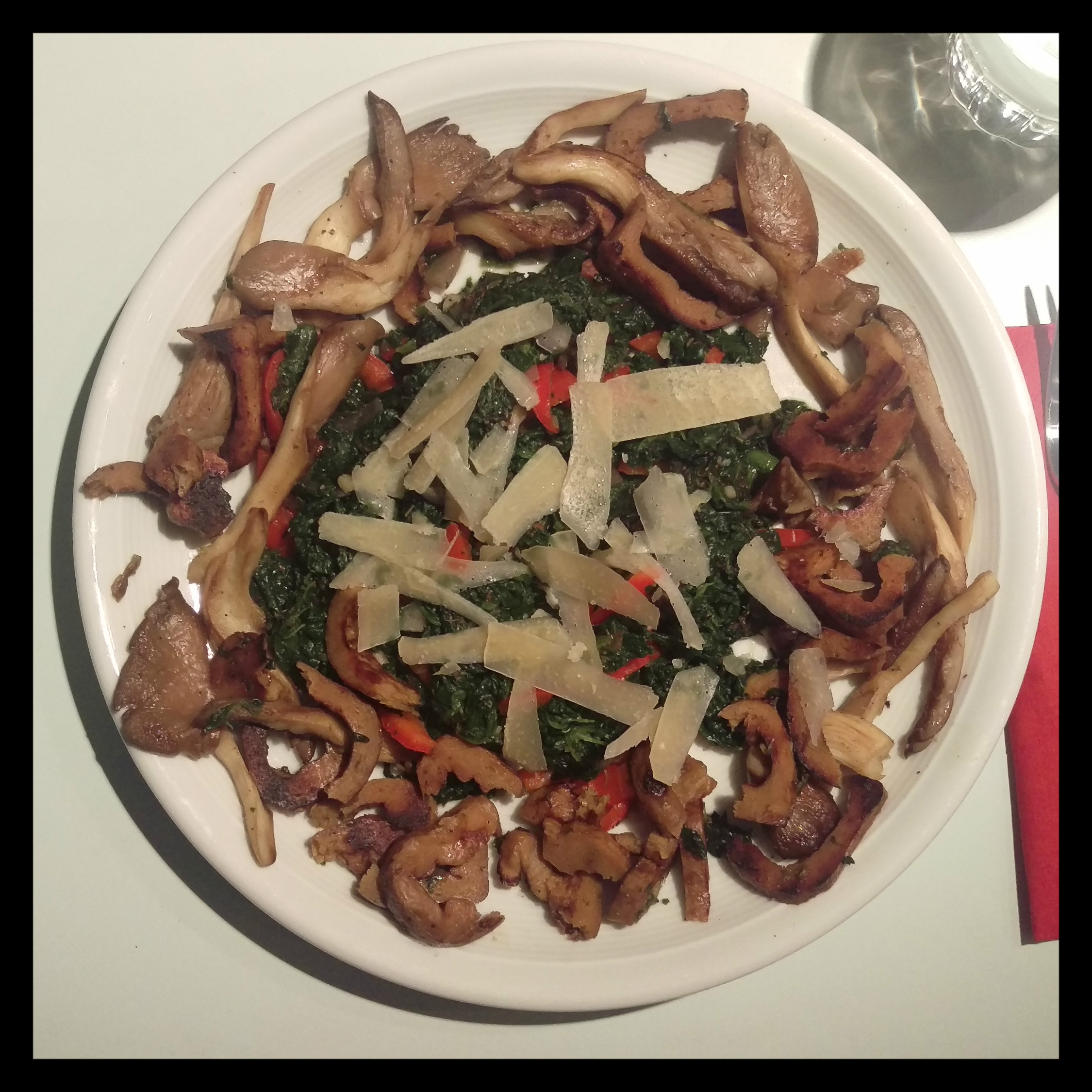 die Spinatmischung in die Mitte eines vorgewärmten Tellers geben und mit dem Parmesan bestreuen, das Ragout drum herum verteilen
