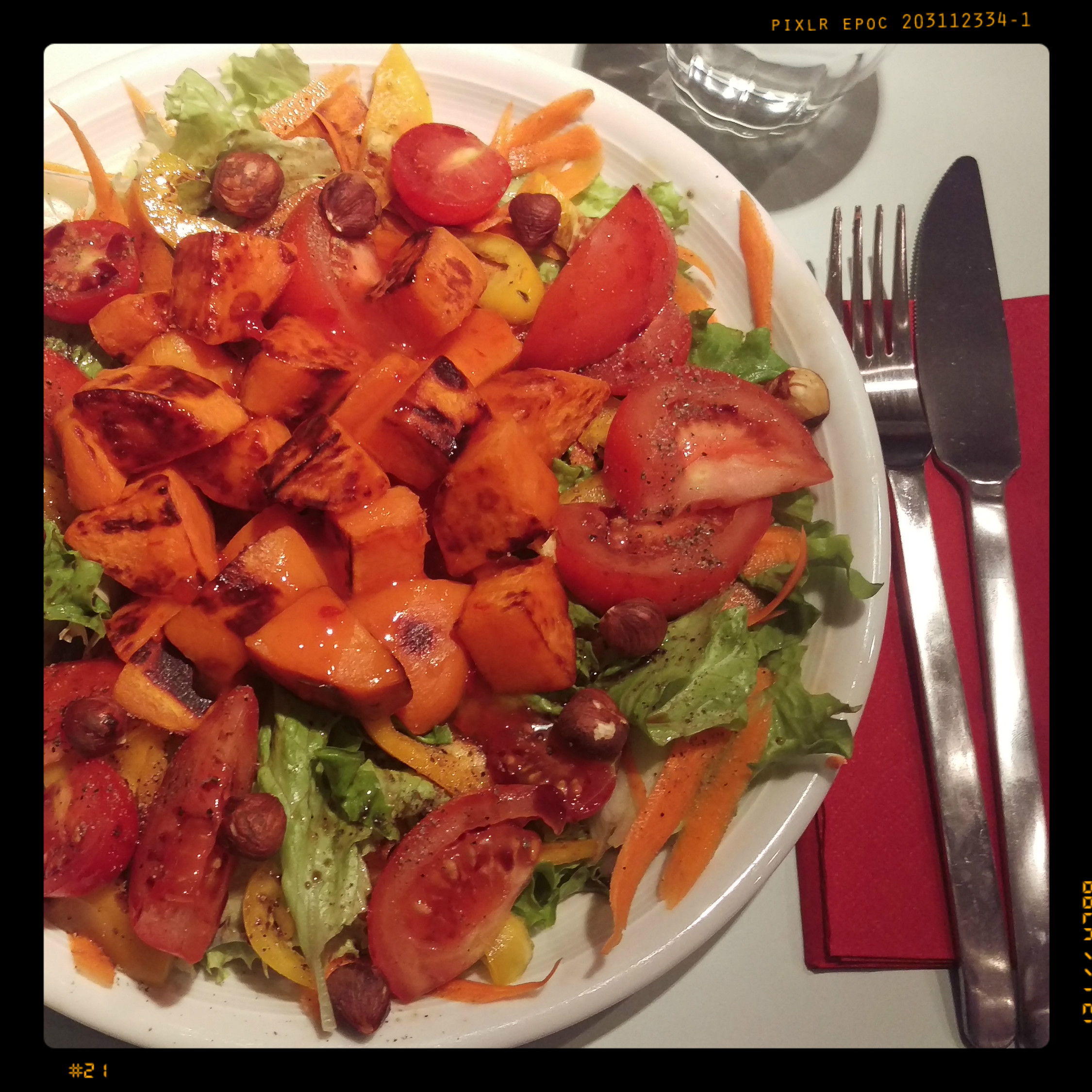 12 Haselnüsse im auf dem Salat verteilen, dabei die Mitte aussparen