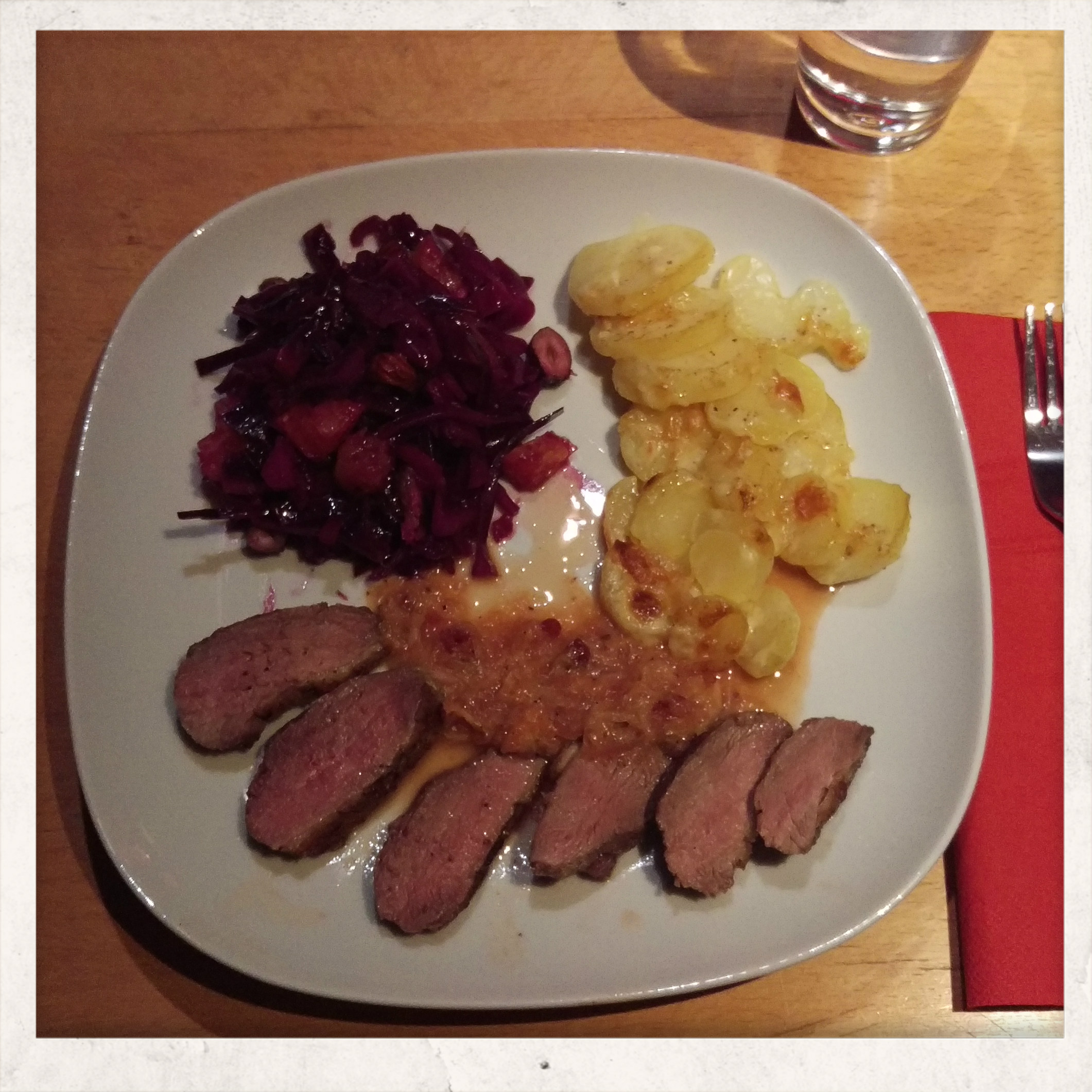 Gratin und Salat auf einem vorgewärmten Teller anrichten, die Entenbrust in Scheiben aufschneiden, dazu legen und die Orangensauce dazu geben