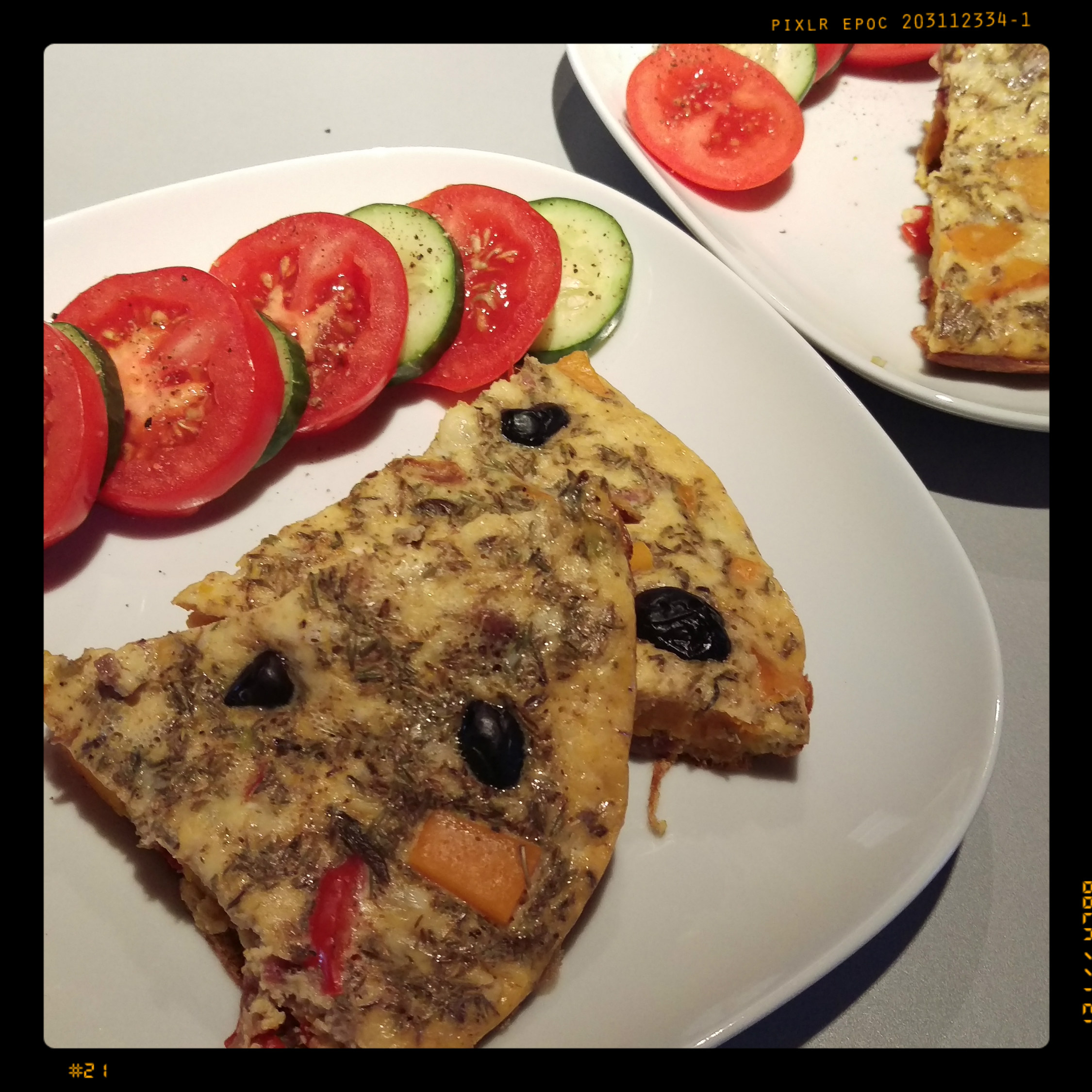 1 EL Kokosöl in der Pfanne mittelstark erhitzen, die Ei-Mischung hineingießen und die Pfanne sofort mit dem Deckel schließen, nach ca. 4 Min. die Hitze auf mittelschwach reduzieren, weitere 10 Min. garen, dann noch ca. 5 Min. bei ganz schwacher Hitze fertig stocken lassen