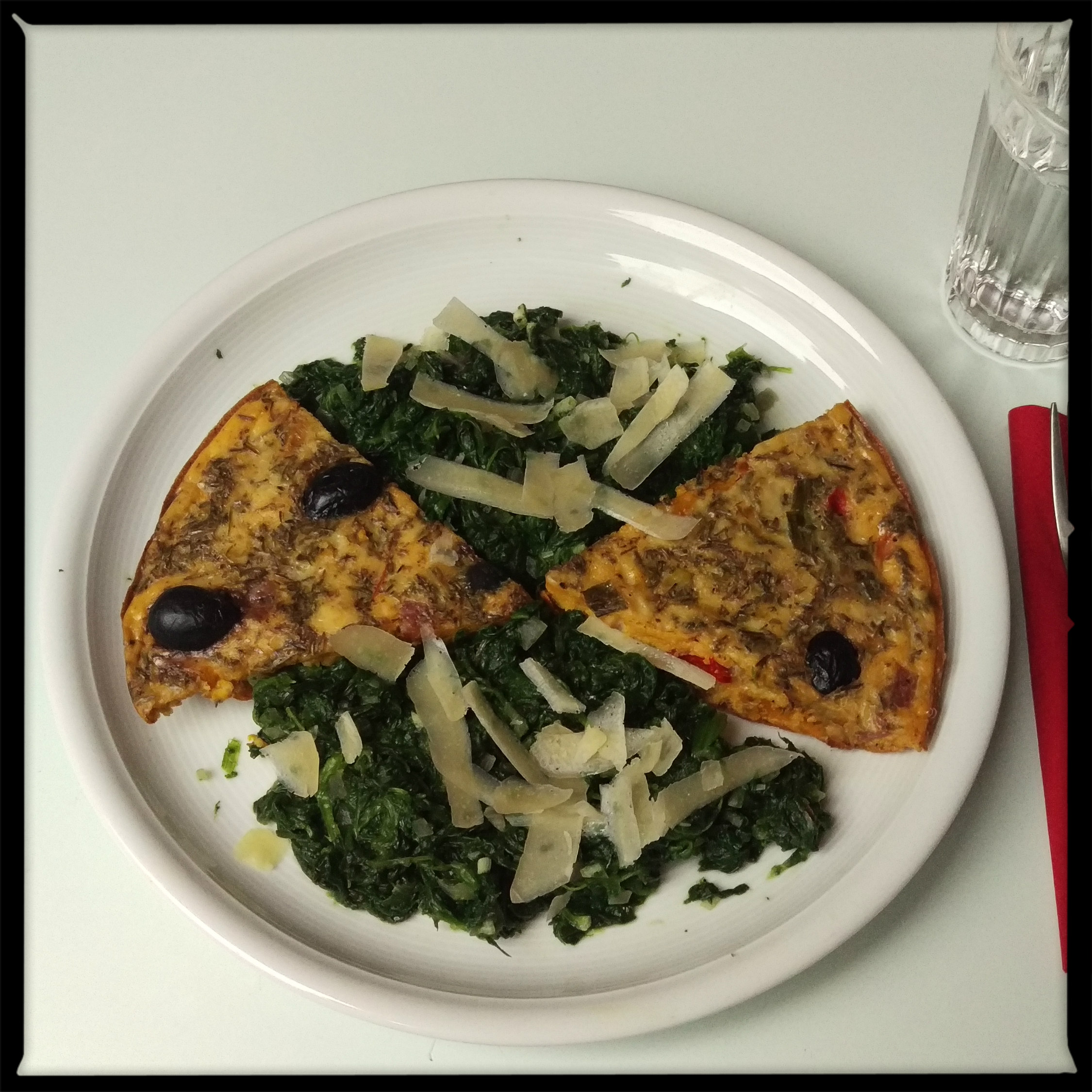 der Tortilla-Rest vom Vortag (siehe 17. Dezember 2015), also quasi die 3. Portion lässt sich prima mit Spinat ergänzen, alternativ die Tortilla frisch zubereiten