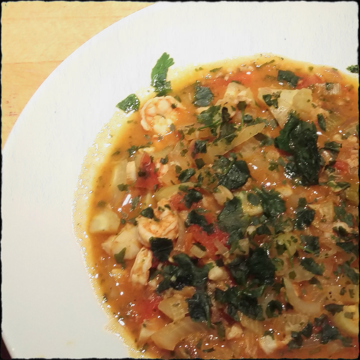 1 geh. EL Tomatenmark zum Fenchel geben, kurz aufkochen, die Garnelen und das Kabeljaufilet hinzufügen und alles noch einmal 5 Min. köcheln lassen, mit