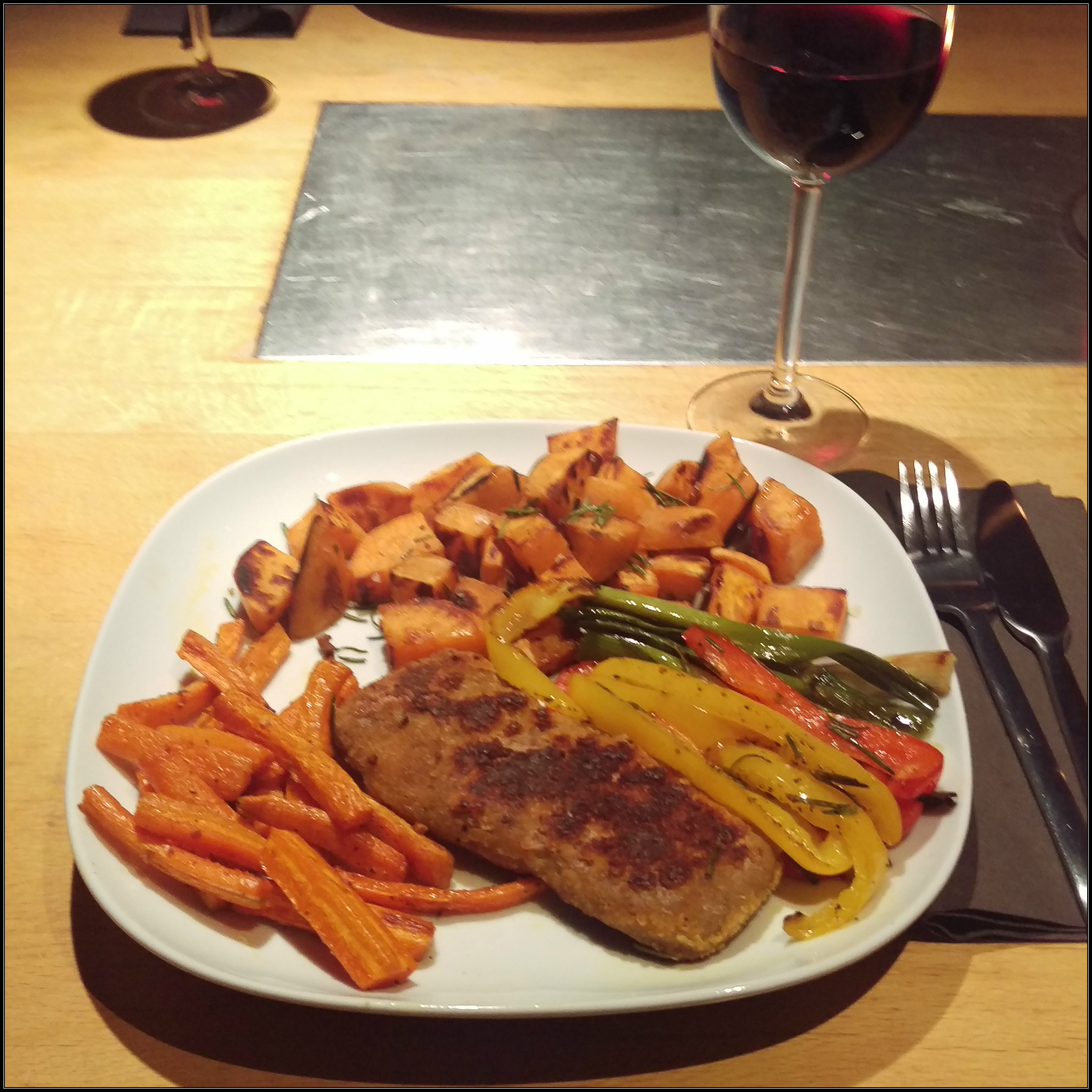 Süßkartoffeln und Gemüse auf zwei vorgewärmten Tellern verteilen und mit den Seitan-Schnitzeln servieren