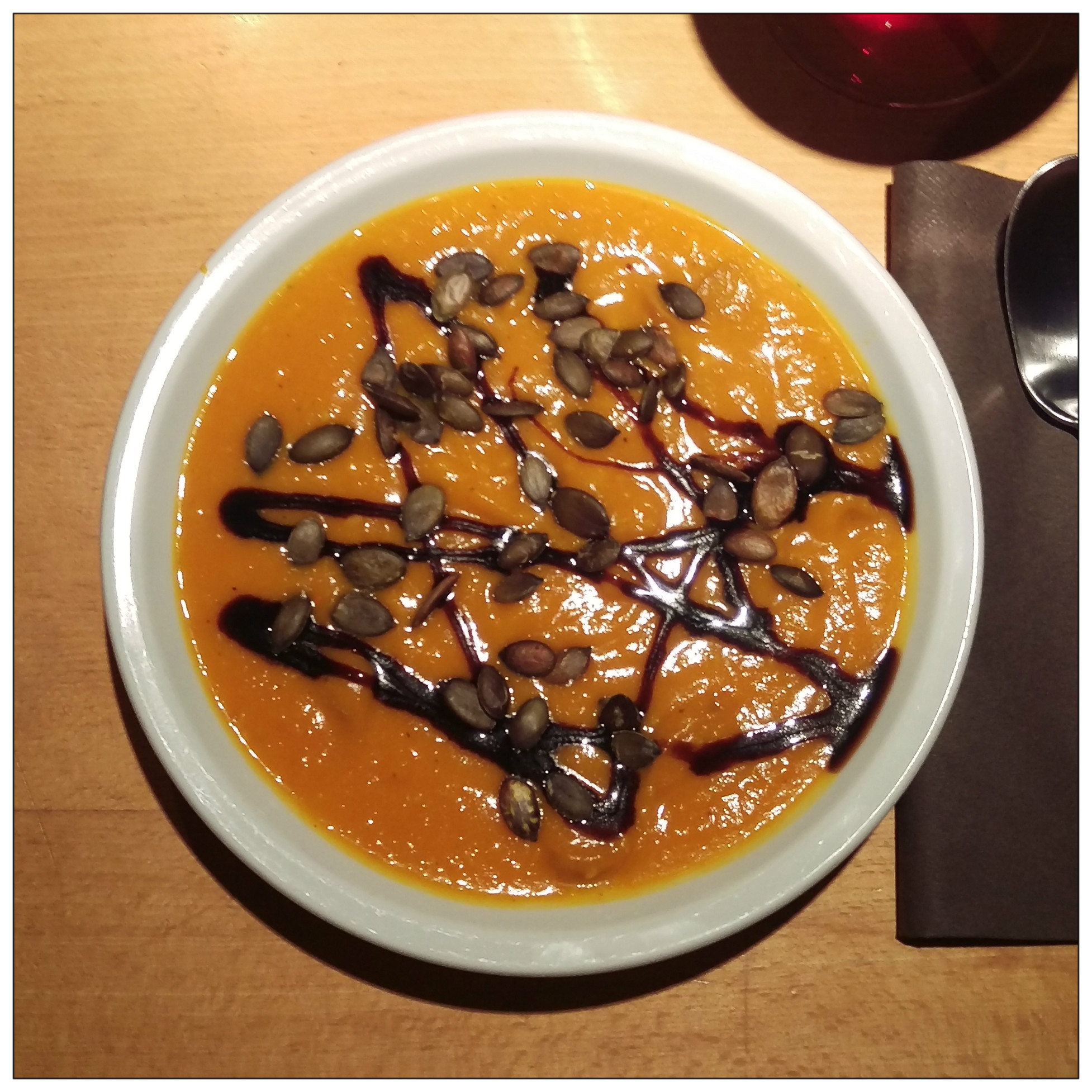 einige Spritzer Balsamico-Crema darauf verteilen und die Kürbiskerne darüberstreuen
