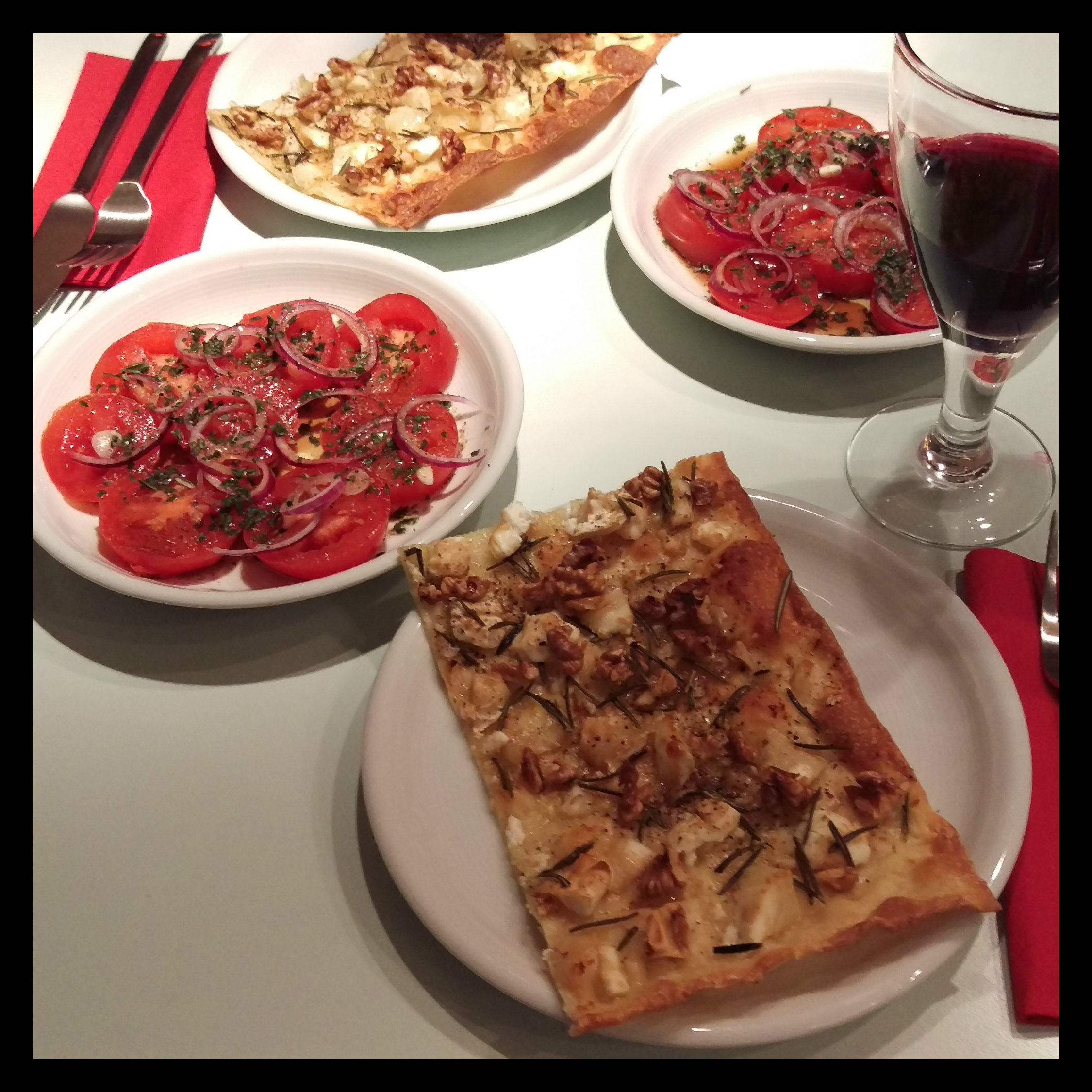den Flammkuchen in vier Stücke teilen und die Stücke (ggf. in 2 Portionen nacheinander) zu dem Tomatensalat servieren