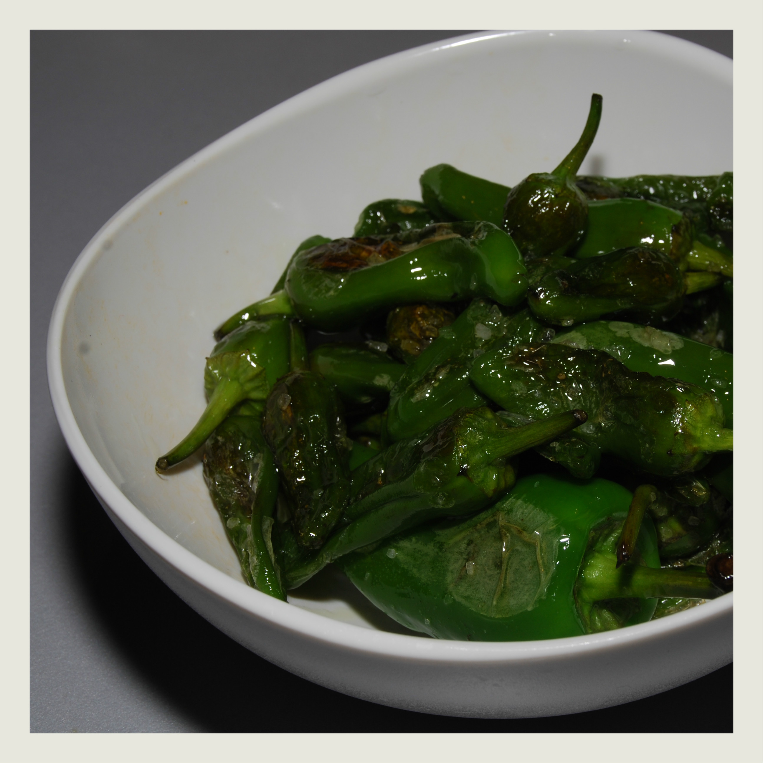 200 g kleine grüne Brat-Paprika hinzugeben und unter ständigem Wenden 1 – 2 Min. braten, bis die Haut Blasen wirft, dann aus der Pfanne nehmen, auf