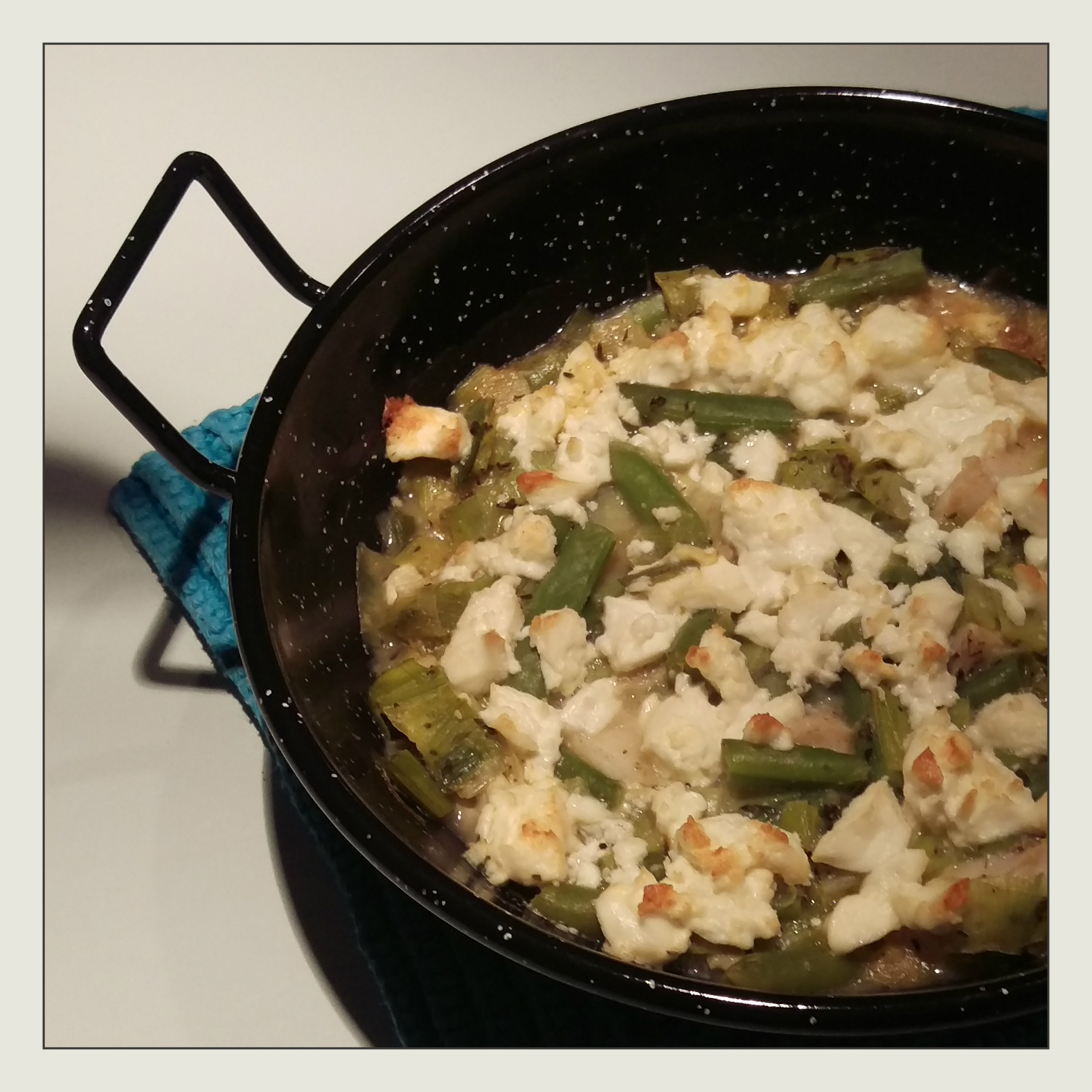 50 g Schafskäse (Feta – leicht zerkrümelt) bestreuen, auf der mittleren Einschubleiste im Backofen ca. 15 Min. garen