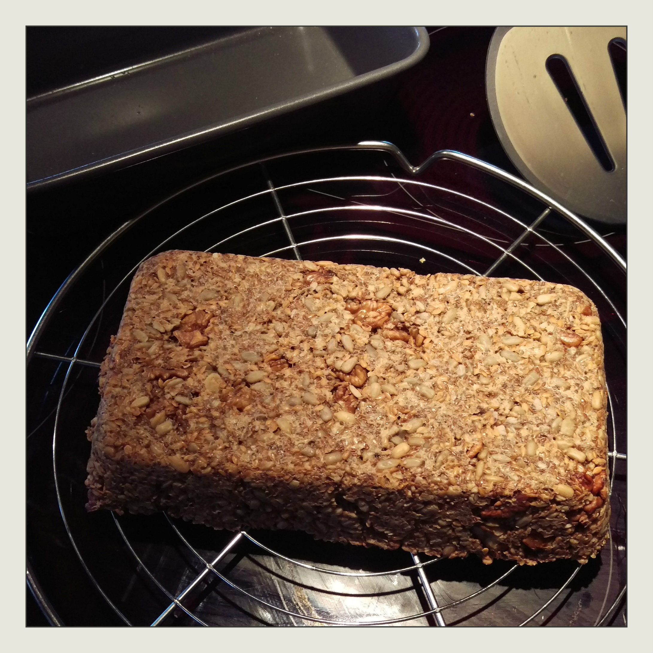 370 ml warmen Wasser (nicht heiß, aber warm genug, dass das Kokosöl schmilzt) mischen, über die Saatenmischung geben und alles gut miteinander vermischen, eine Brotbackform mit