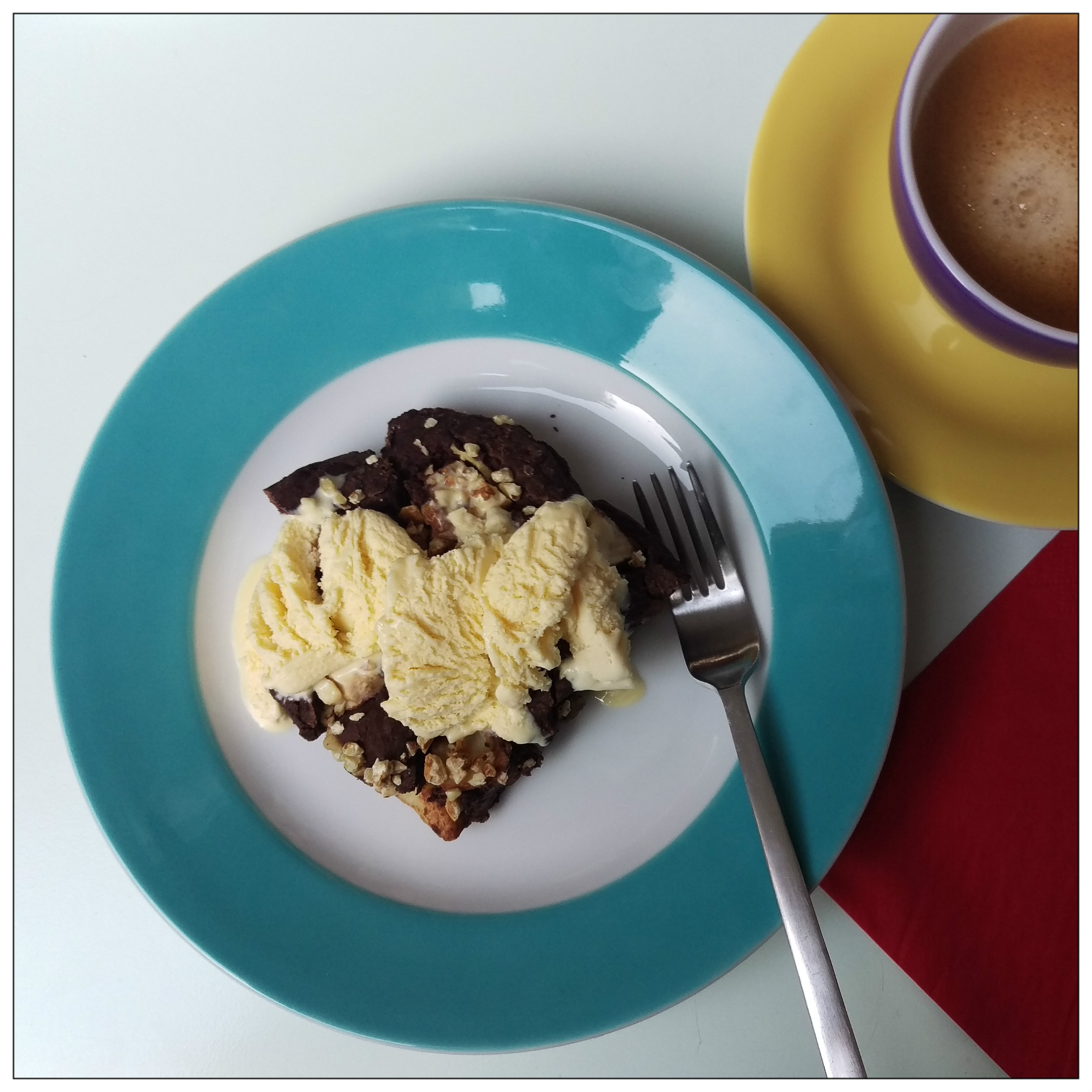 am 14.03.2016 hatte ich einen Teil des Brownies eingefroren, den habe ich nun bei Raumtemperatur auftauen lassen und dann kurz in der Microwelle erwärmt, dazu passt sehr gut
