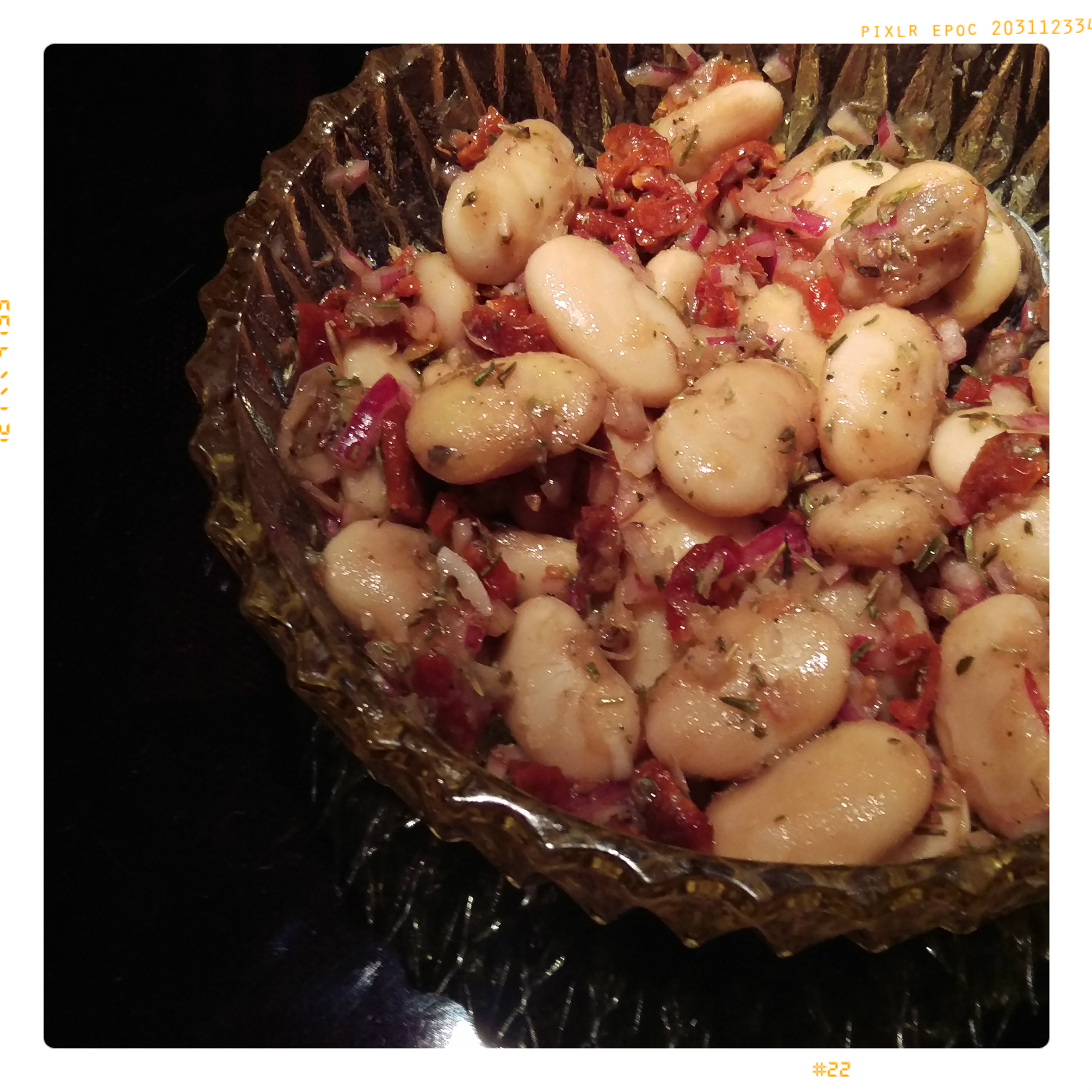 für zwei als Lunch, zusammen mit einem frischen Blatt-/Tomaten-Salat, der Bohnensalat sollte schon einige Stunden vor dem Essen oder auch am Vortag zubereitet werden, da er durchziehen muss, und wenn man die Bohnen selbst kocht, muss ein Tag Vorbereitung mehr eingeplant werden