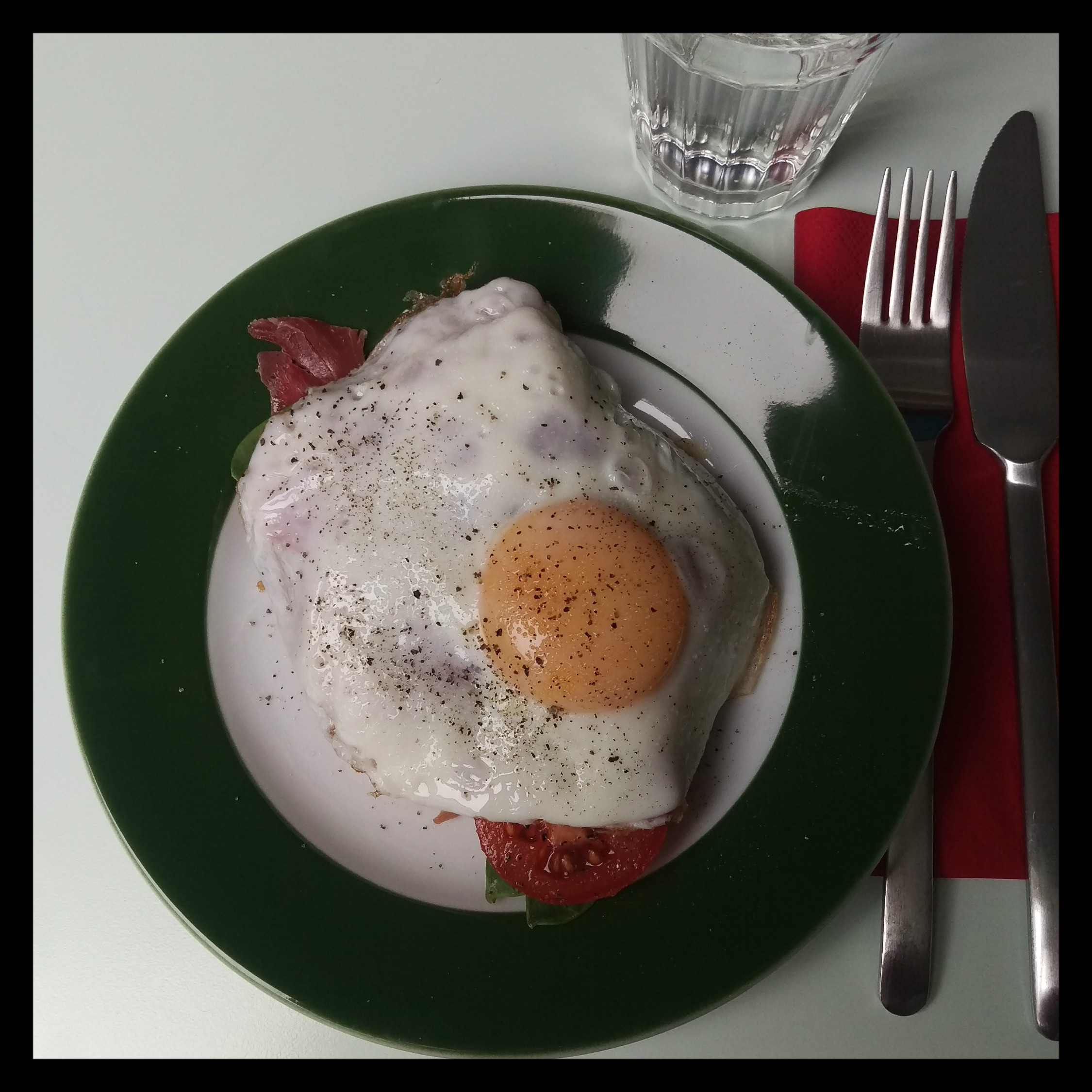 1 TL Olivenbratöl aufschlagen und unter dem Deckel in ca. 2 – 3 Min. braten, anschließend das Spiegelei auf das belegte Brot geben und mit