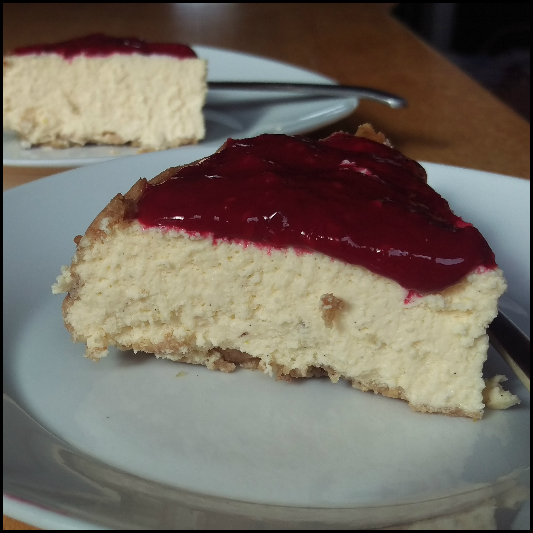 den Käsekuchen in Stücke teilen und die Himbeersauce darauf verteilen
