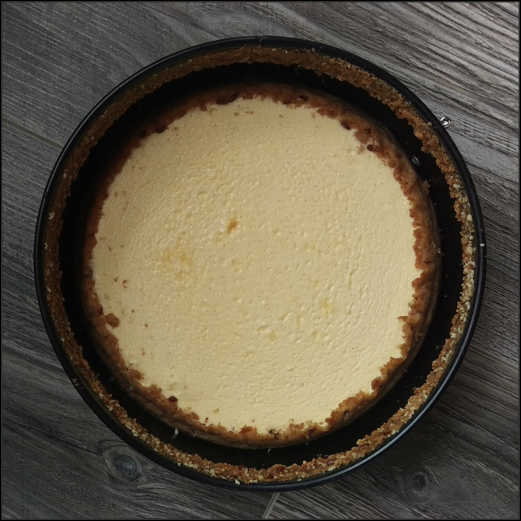 die Frischkäsemasse in die Springform füllen, die Springform in das Wasserbad setzen und ca. 60 Min. backen, in dieser Zeit keinesfalls die Backofentür öffnen