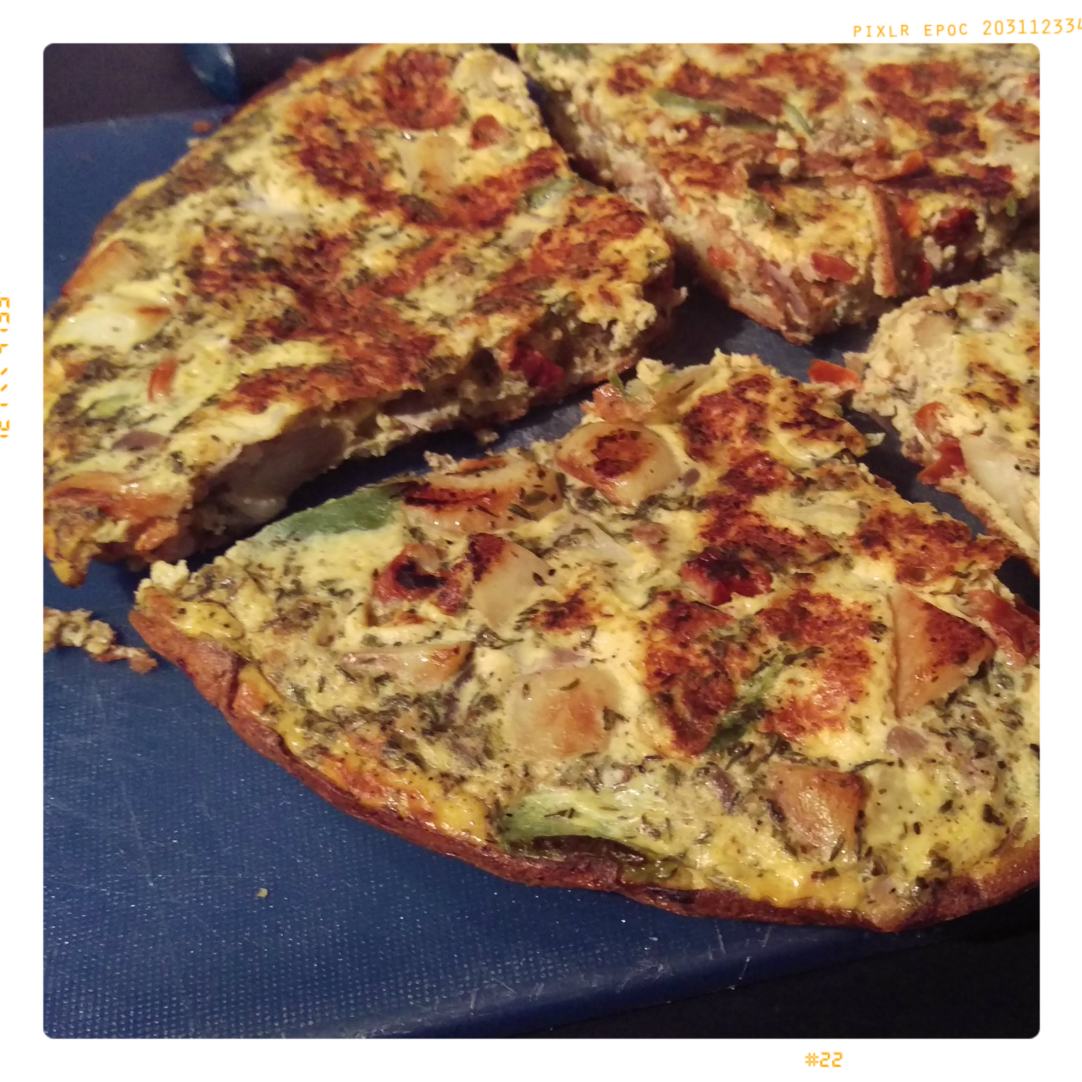 1 EL Bratolivenöl mittelstark erhitzen, die Eimasse in die Pfanne geben und die Pfanne sofort schließen, nach ca. 3 Minuten die Hitze auf mittelschwach reduzieren, wenn nach ca. 8 Min. die Oberfläche gestockt ist, die Tortilla über den Deckel wenden und in