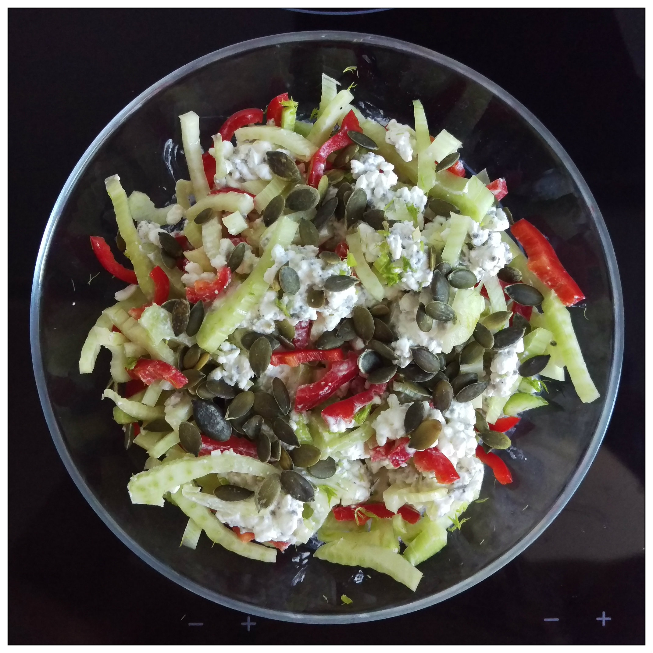in Streifen schneiden, unter den Hüttenkäse mischen, mit