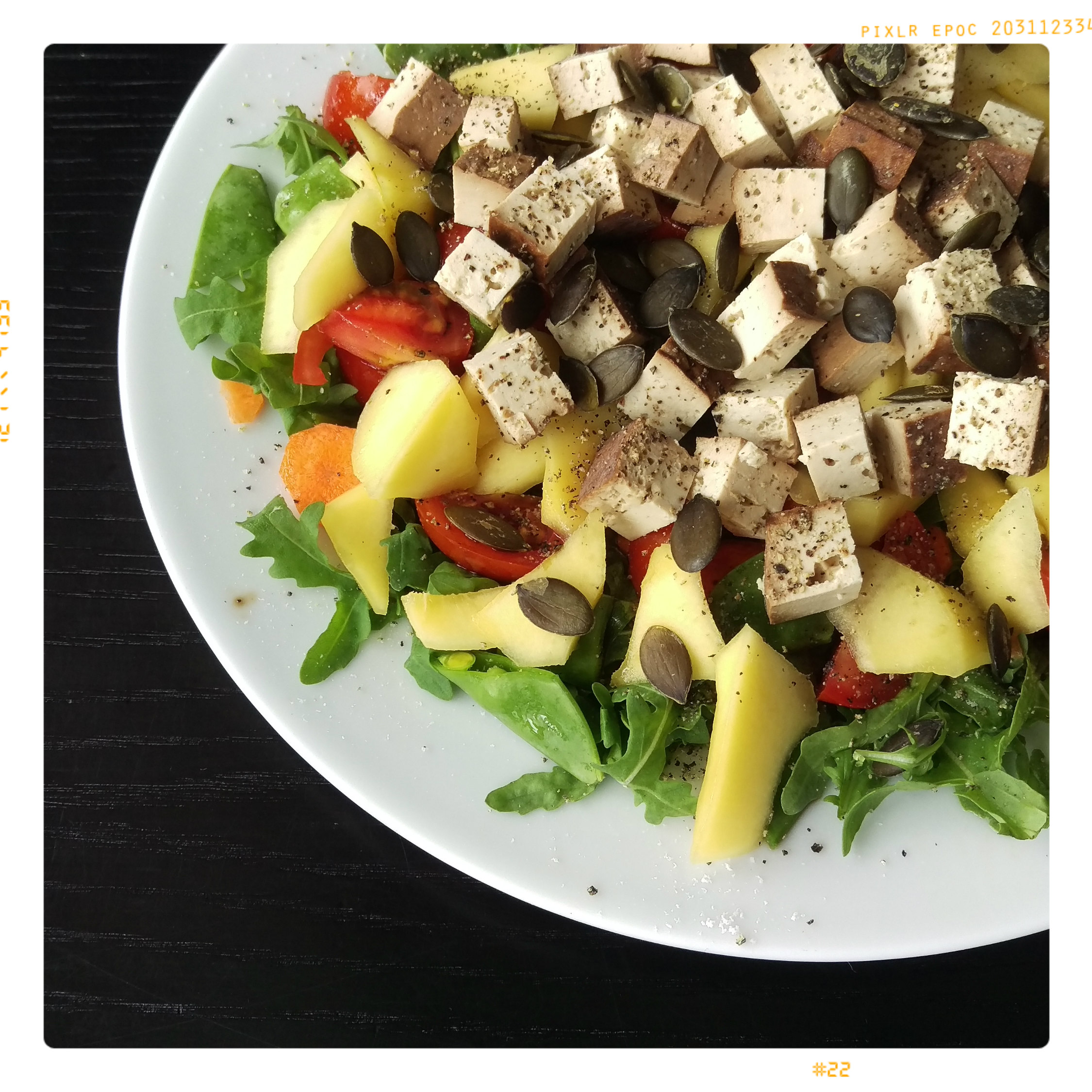 100 g Räucher-Tofu (z. B. Alnatura – gewürfelt, kurz in der Mikrowelle erwärmt) bestreuen, noch mit etwas