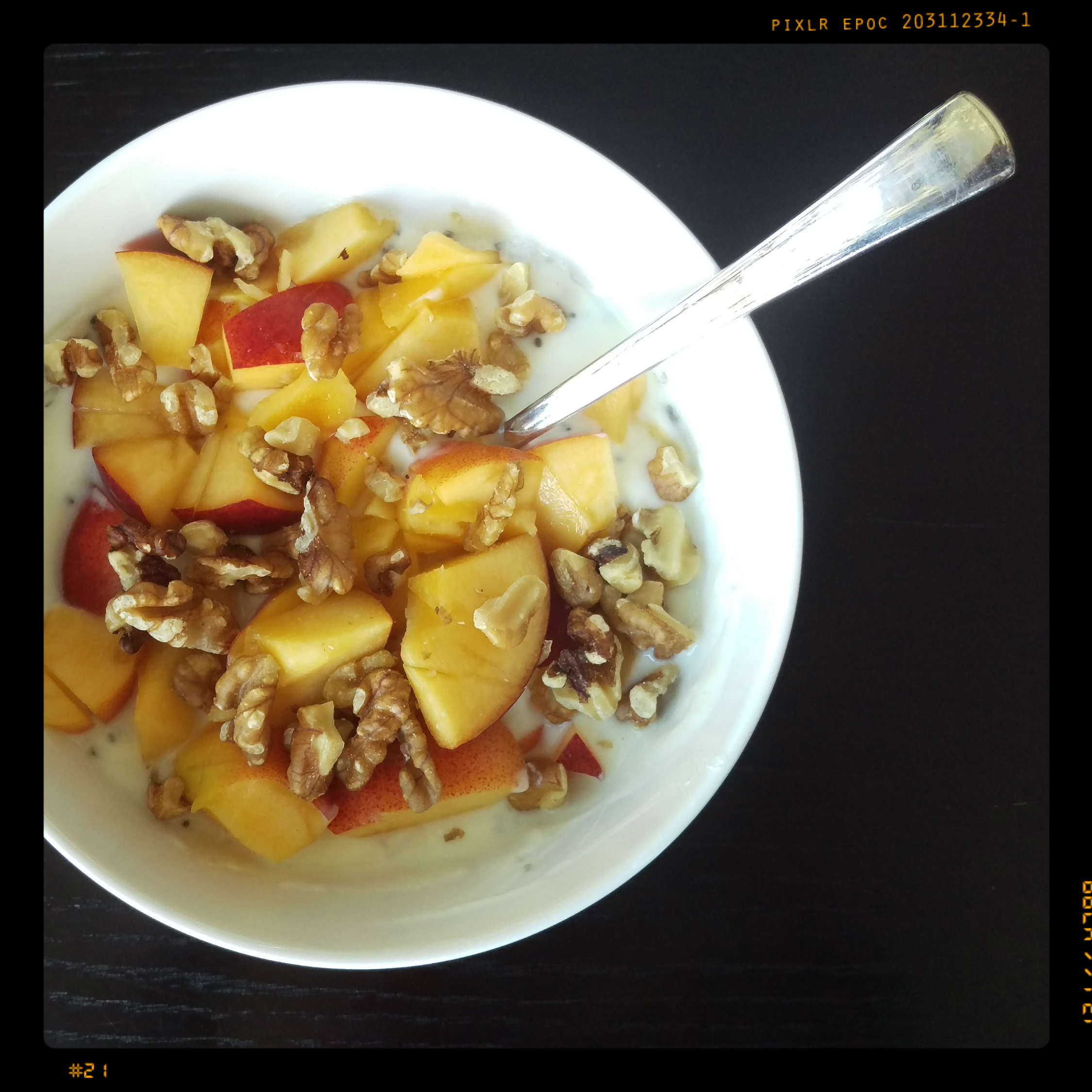 1 Pfirsich klein schneiden und darüber geben, dann mit