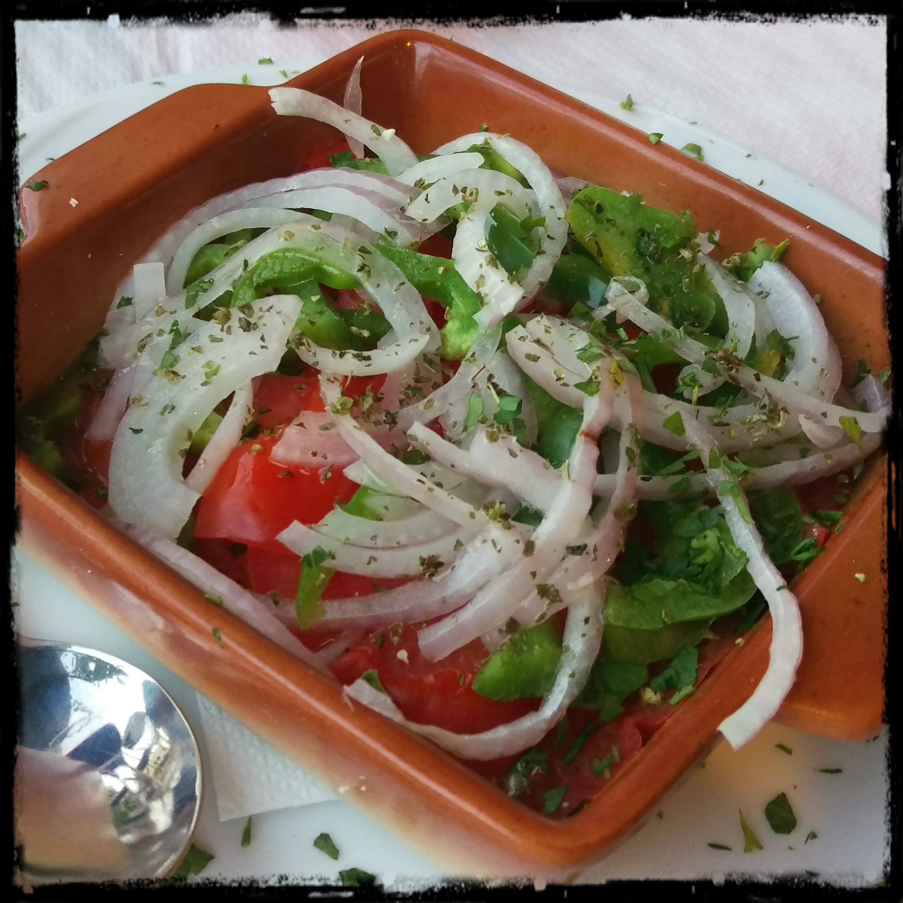 frisch gemahlenem schwarzen Pfeffer würzen, einen Teil der Petersilie und dann die Paprikastreifen und Zwiebelringe nacheinander darauf verteilen, mit der Petersilie und