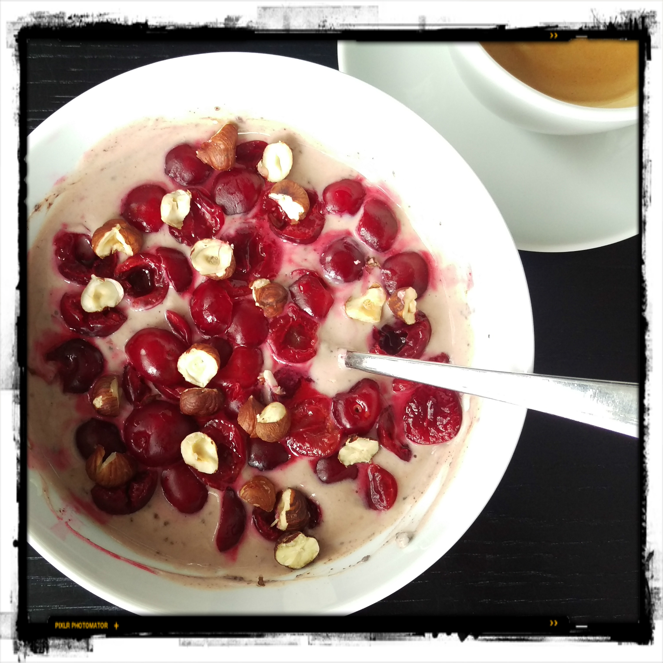 2 Handvoll Sauerkirschen (halbiert, entsteint) darüber geben und mit