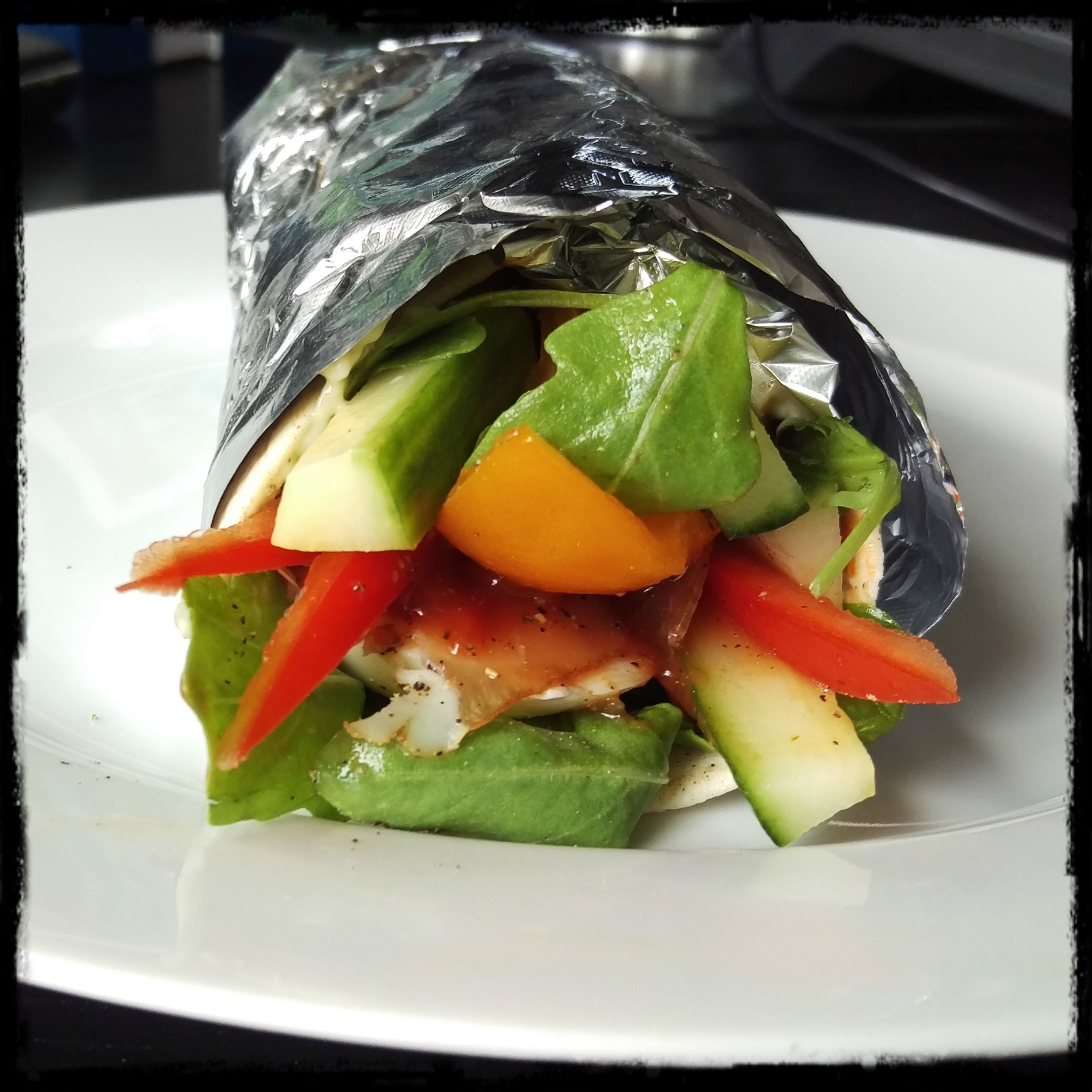 frisch gemahlenem schwarzen Pfeffer würzen, zu einem Wrap fest zusammenrollen und in