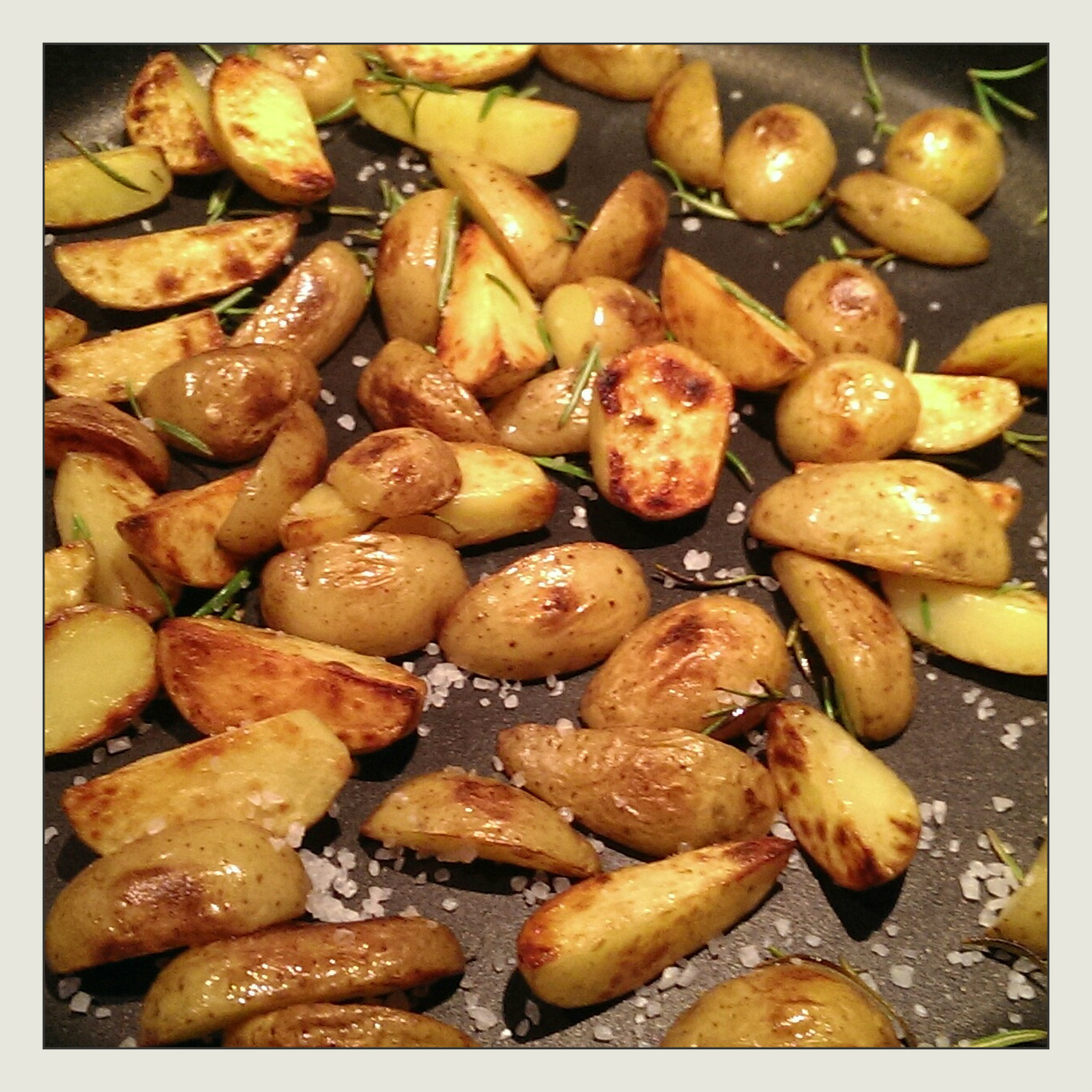 1 EL Kokosöl in einer großen Pfanne mit Deckel kurz recht heiß anbraten, dann bei mittlerer Hitze in ca. 15 Minuten goldbraun fast fertiggaren, dann den Rosmarin hinzugeben und noch etwa fünf Minuten ohne Deckel weiter rösten, mit