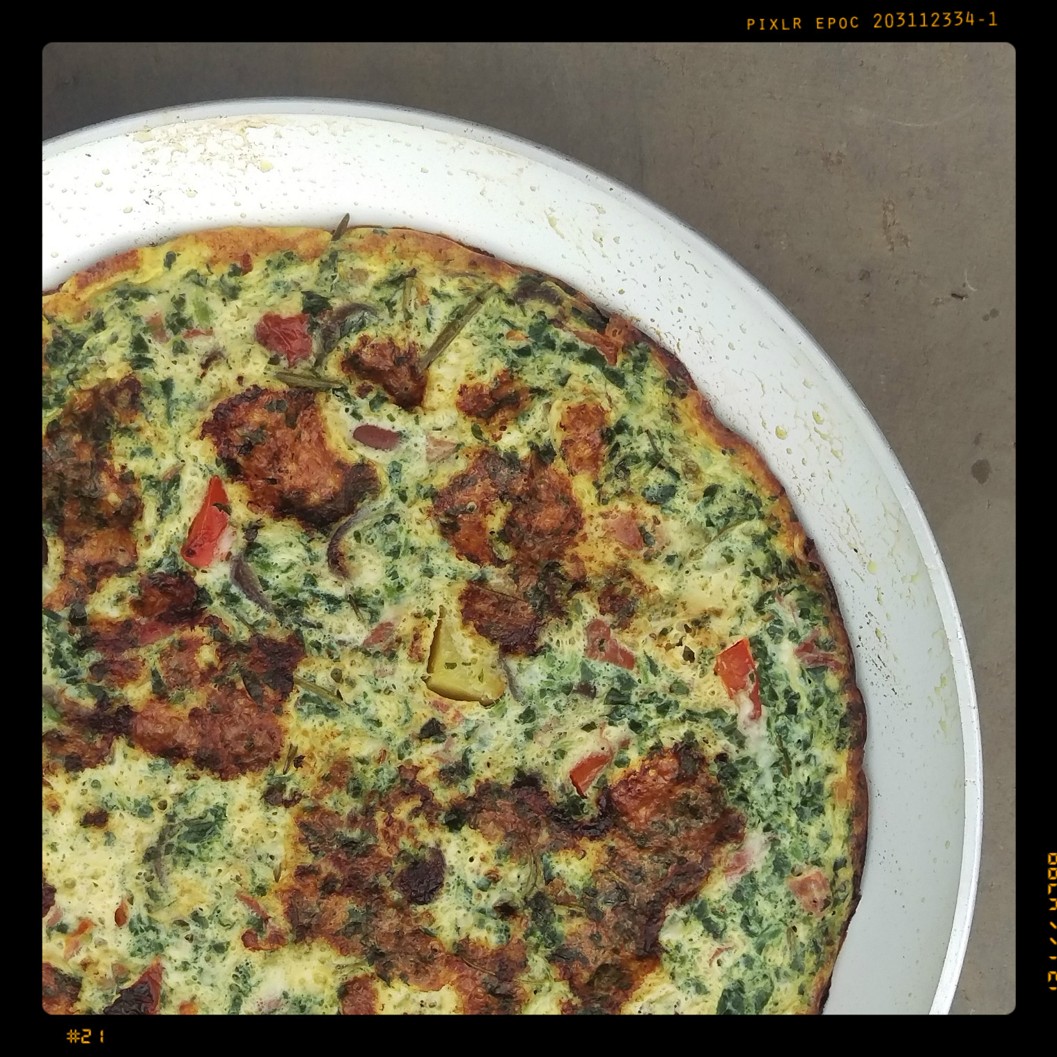 6 Kalamata-Oliven hineingeben, dann die Pfanne sofort mit dem Deckel schließen, nach ca. 5 Minuten die Hitze auf mittelschwach reduzieren, wenn nach weiteren ca. 5 Min. die Oberfläche gestockt ist, die Tortilla über den Deckel wenden und in