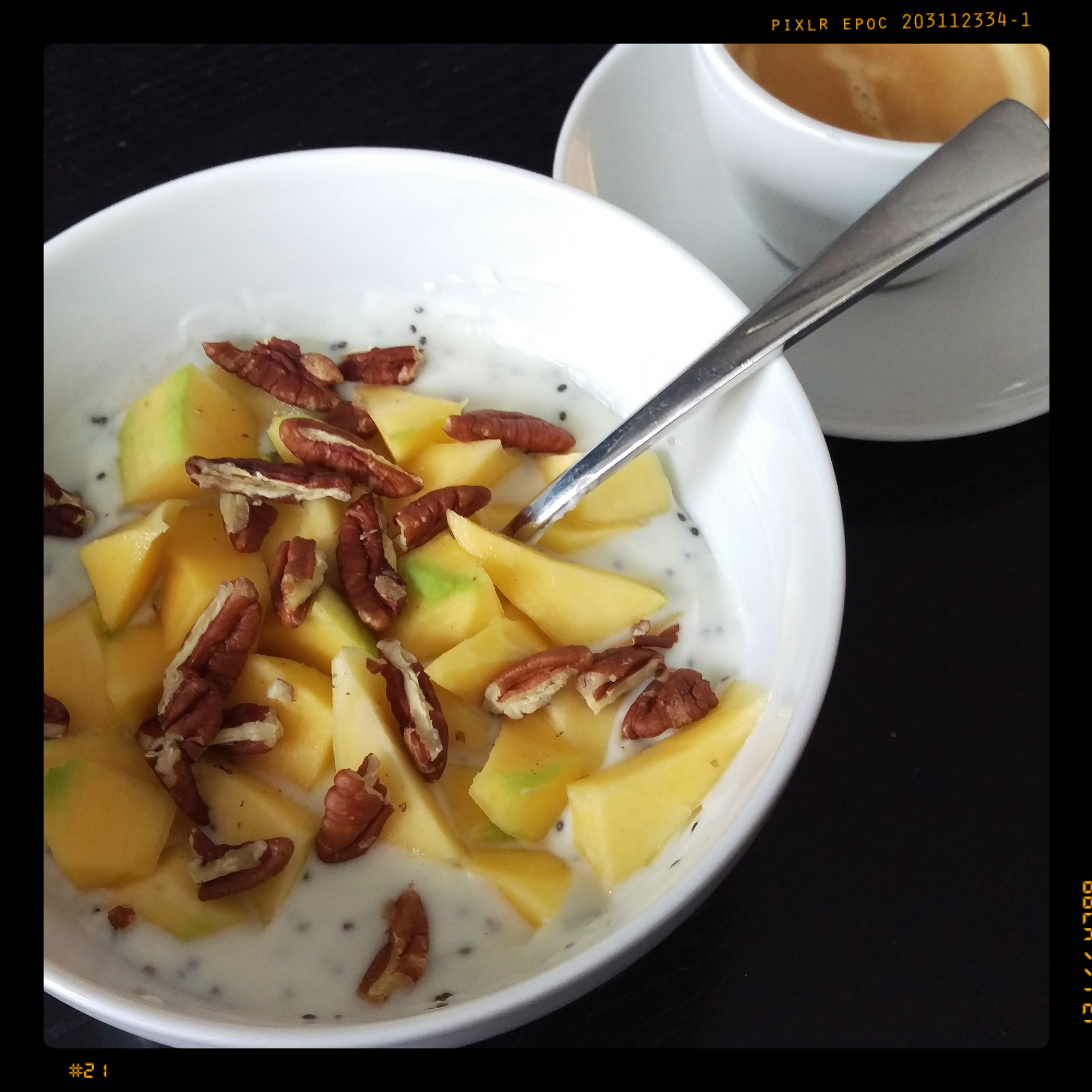 1/2 kleinere Mango in Stücke schneiden, auf dem Joghurt verteilen und mit