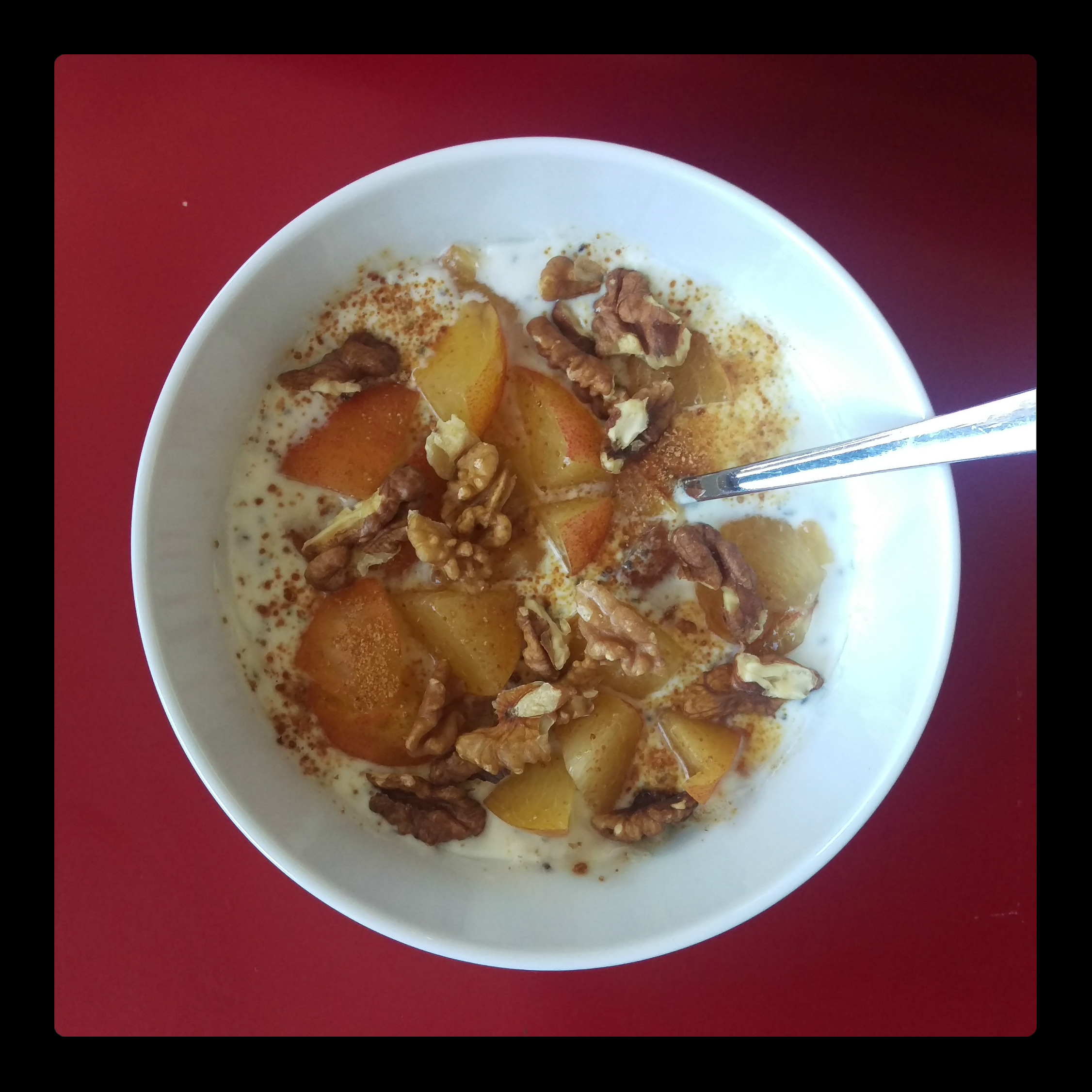 2 rote Pflaumen in Stücke schneiden, auf dem Joghurt verteilen und mit
