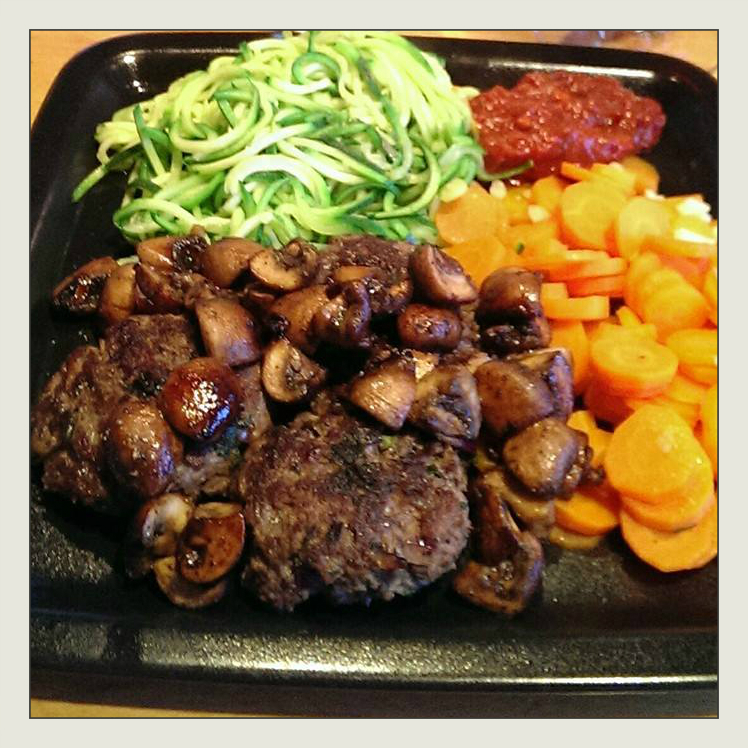 Hacksteaks mit Champignons, Möhren und Spaghetti auf zwei Tellern anrichten und mit der BBQ-Sause servieren