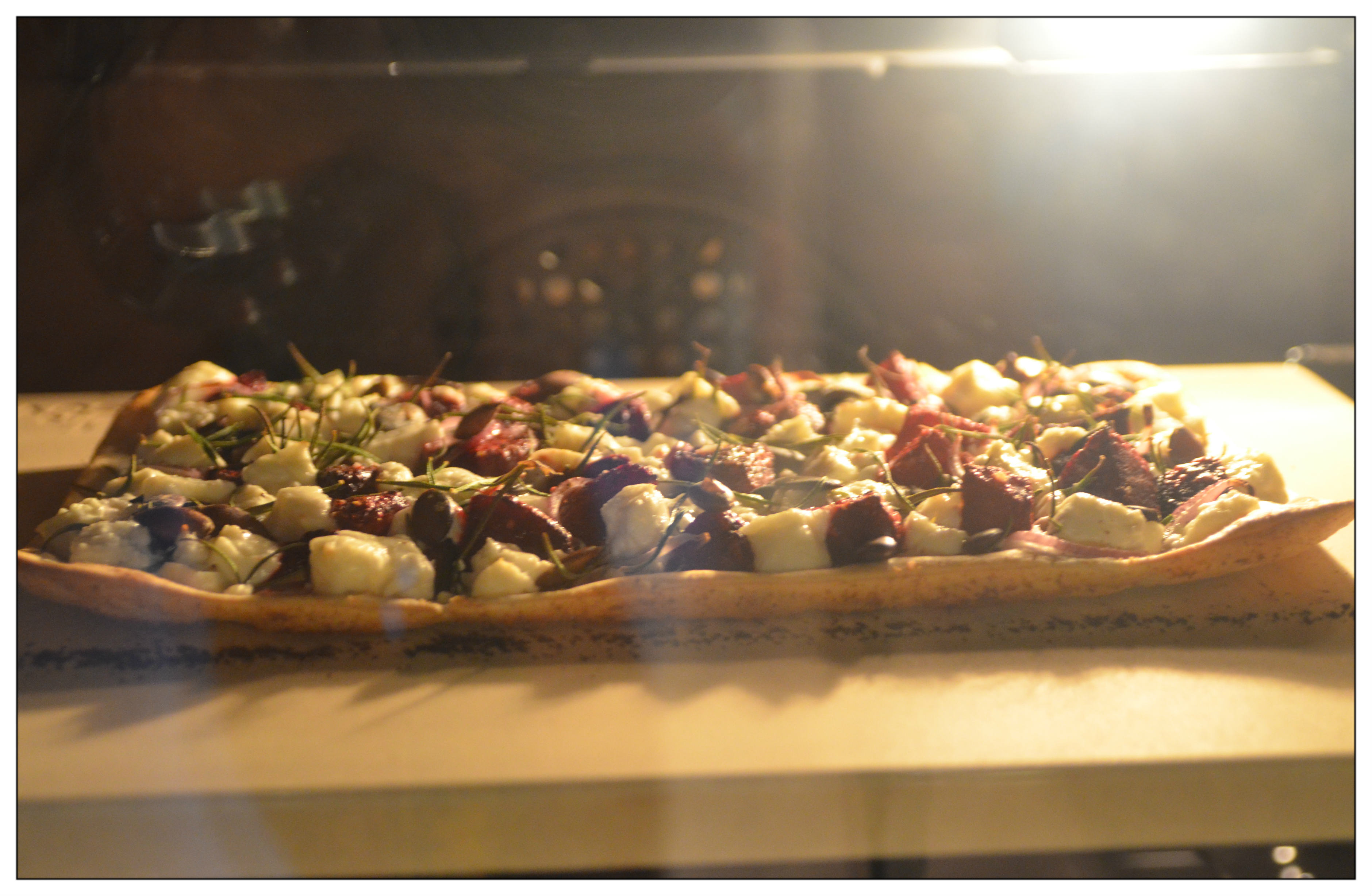 den Flammkuchen auf den Stein gleiten lassen und ca. 6 Min. backen (alternativ auf Backpapier ca. 10 – 12 Min.)