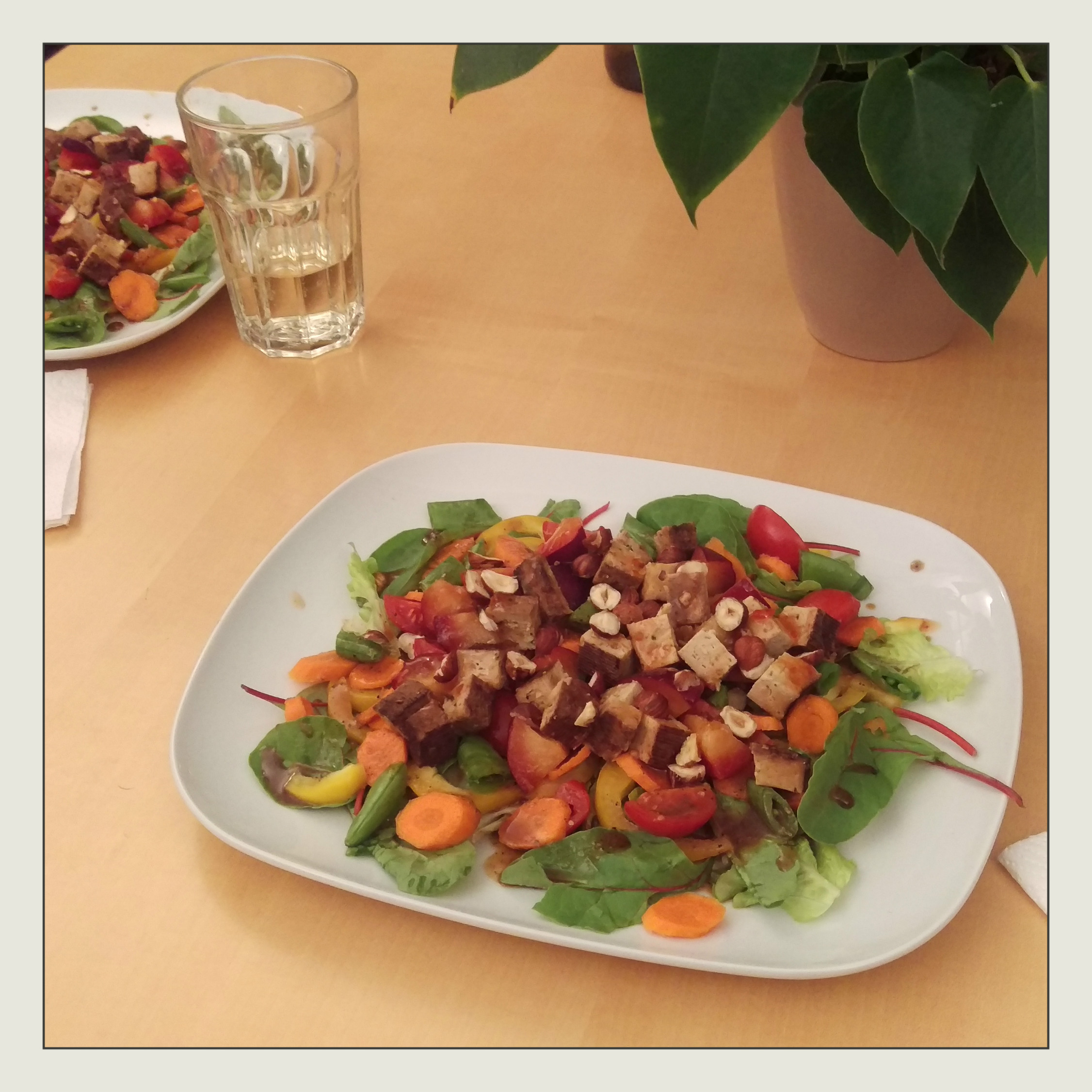 200 g Mandel-Nuss-Tofu (z. B. DM Bio – gewürfelt) in der Mikrowelle erhitzen, auf den Salaten verteilen und mit