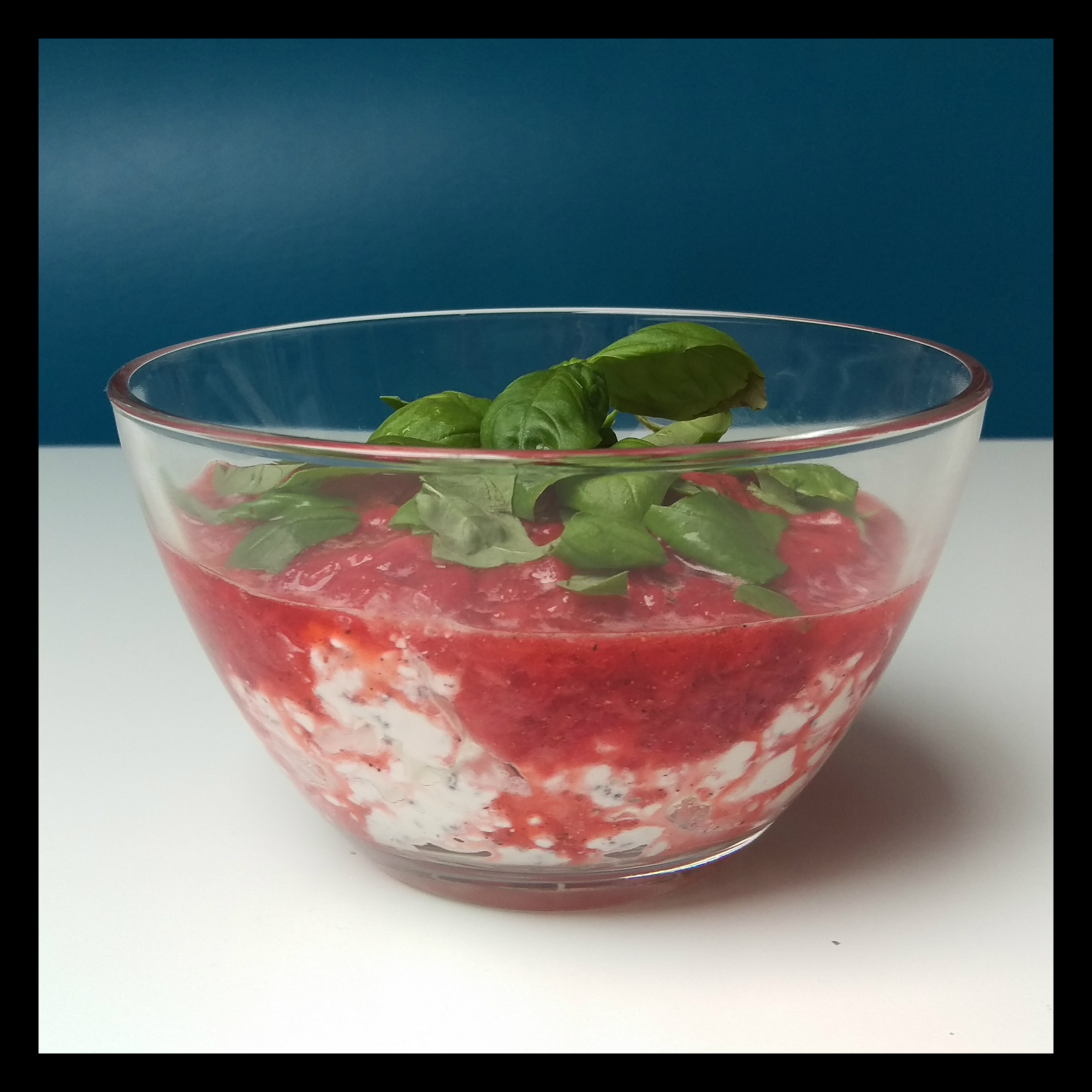 200 g Hüttenkäse mischen, die Erdbeeren mit der Gabel pürieren und mit