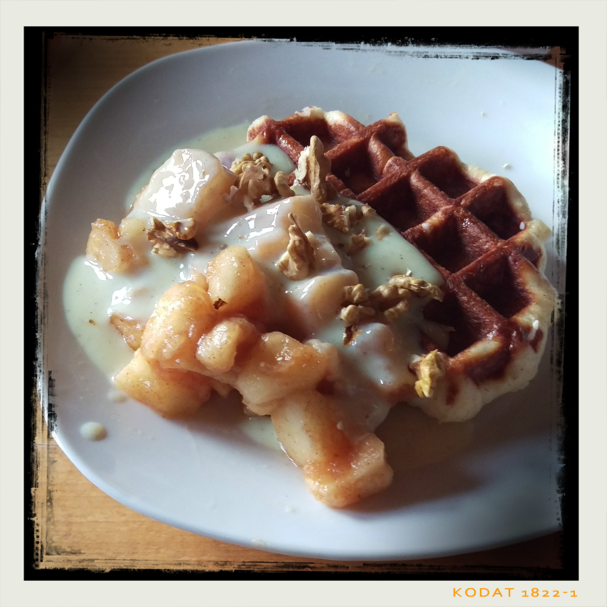 die Waffeln mit dem Apfelkompott und der Vanillesauce und alternativ noch zusätzlich