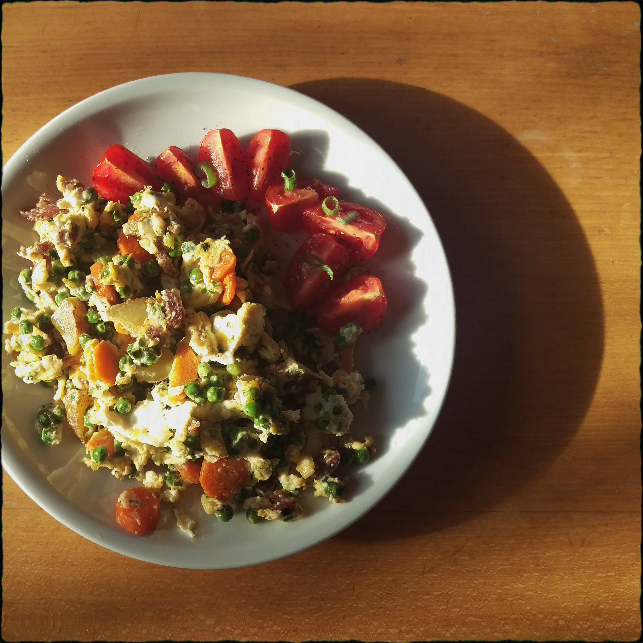 2 Eier (mögl. L o. XL) darüber aufschlagen und unter häufigem Umwenden bei mittelstarker Hitze stocken lassen, dabei mit