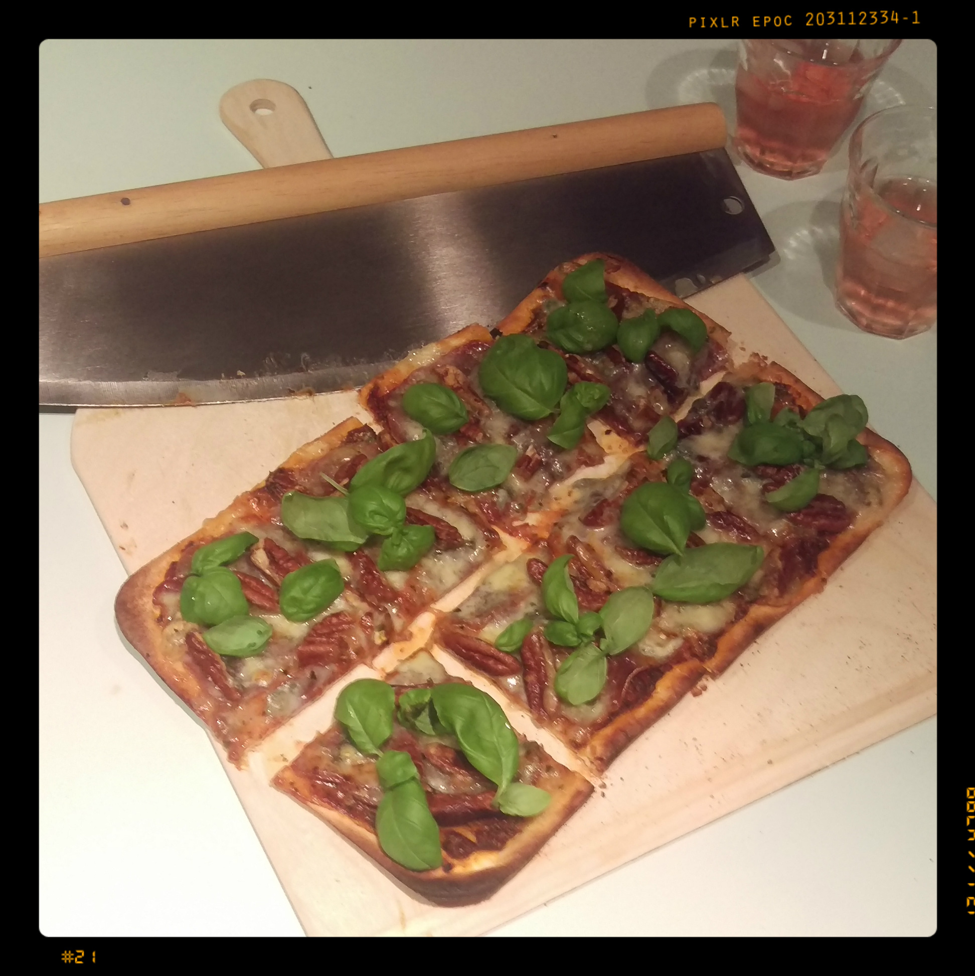 geschmacklich ist es eine Pizza, doch damit das Abendessen weniger Kohlehydrate enthält und ich auch lieber dünnere Pizza mag, nehme ich Flammkuchenteig