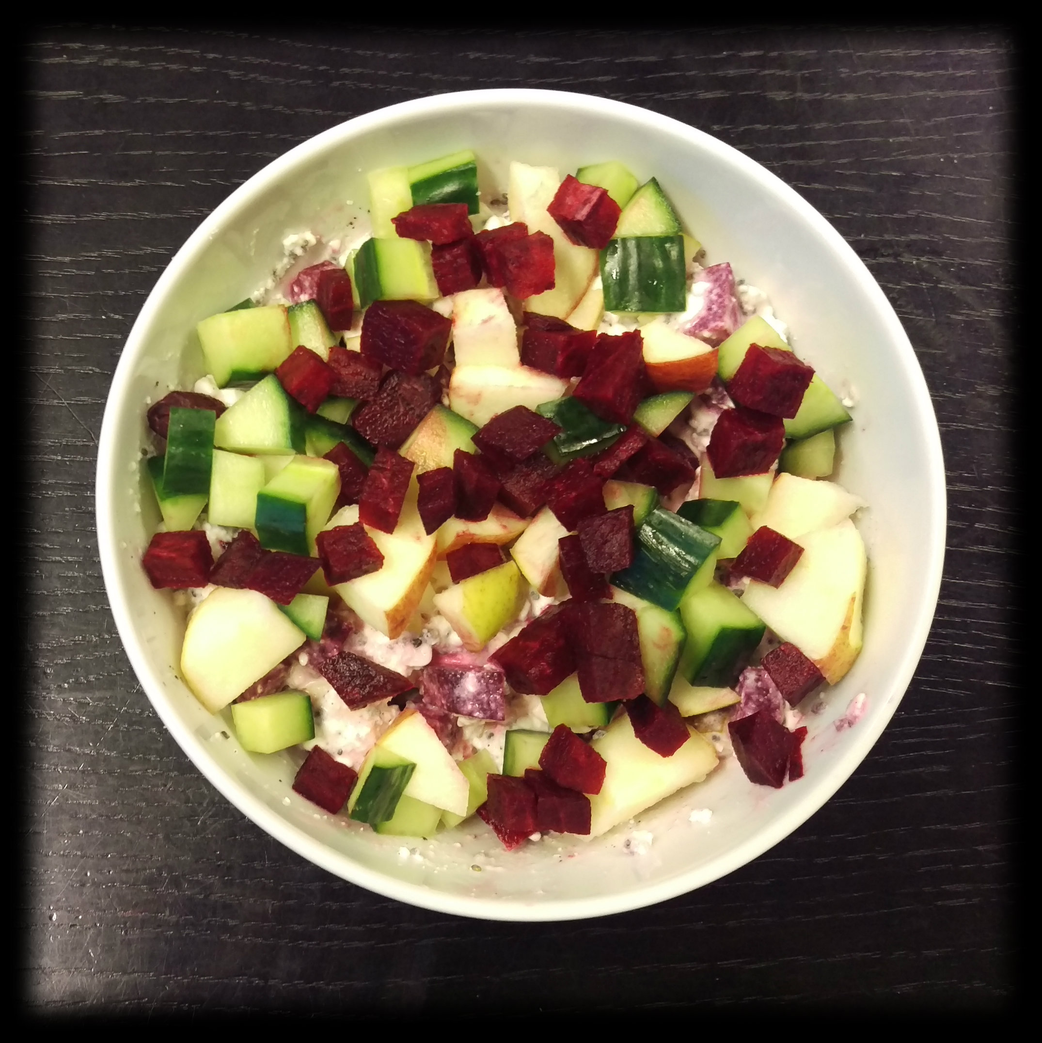 1 kleinen Apfel in kleinere Würfel schneiden, zum Teil mit dem Hüttenkäse mischen und den Rest darübergeben