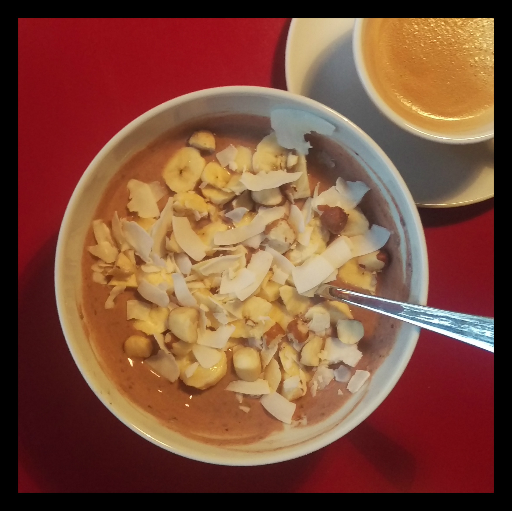1 kl. Banane kleinschneiden, auf dem Schokojoghurt verteilen und mit
