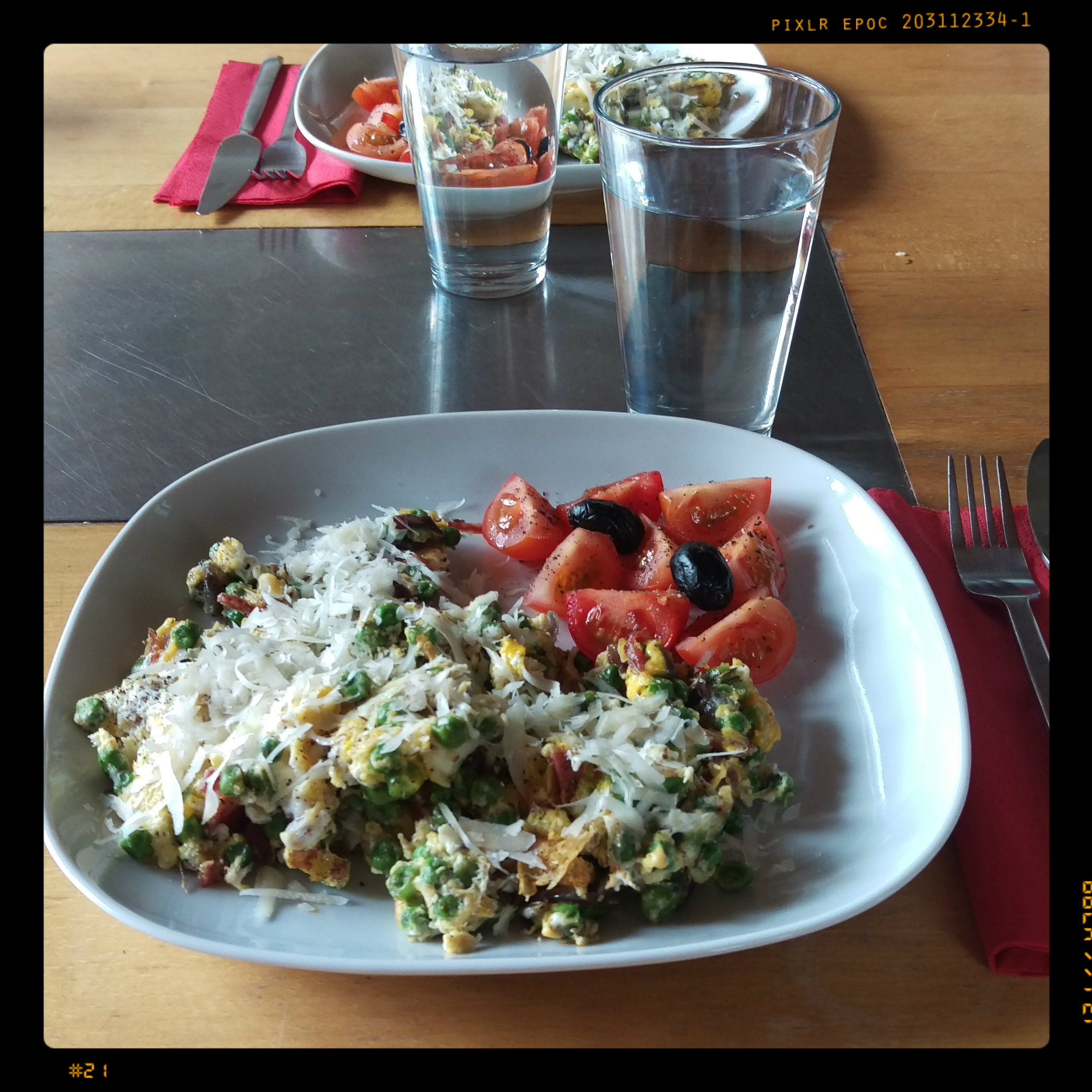 6 Eier (mögl. M) über der Gemüsemasse aufschlagen und unter häufigem Umwenden bei mittelstarker Hitze stocken lassen, dabei mit