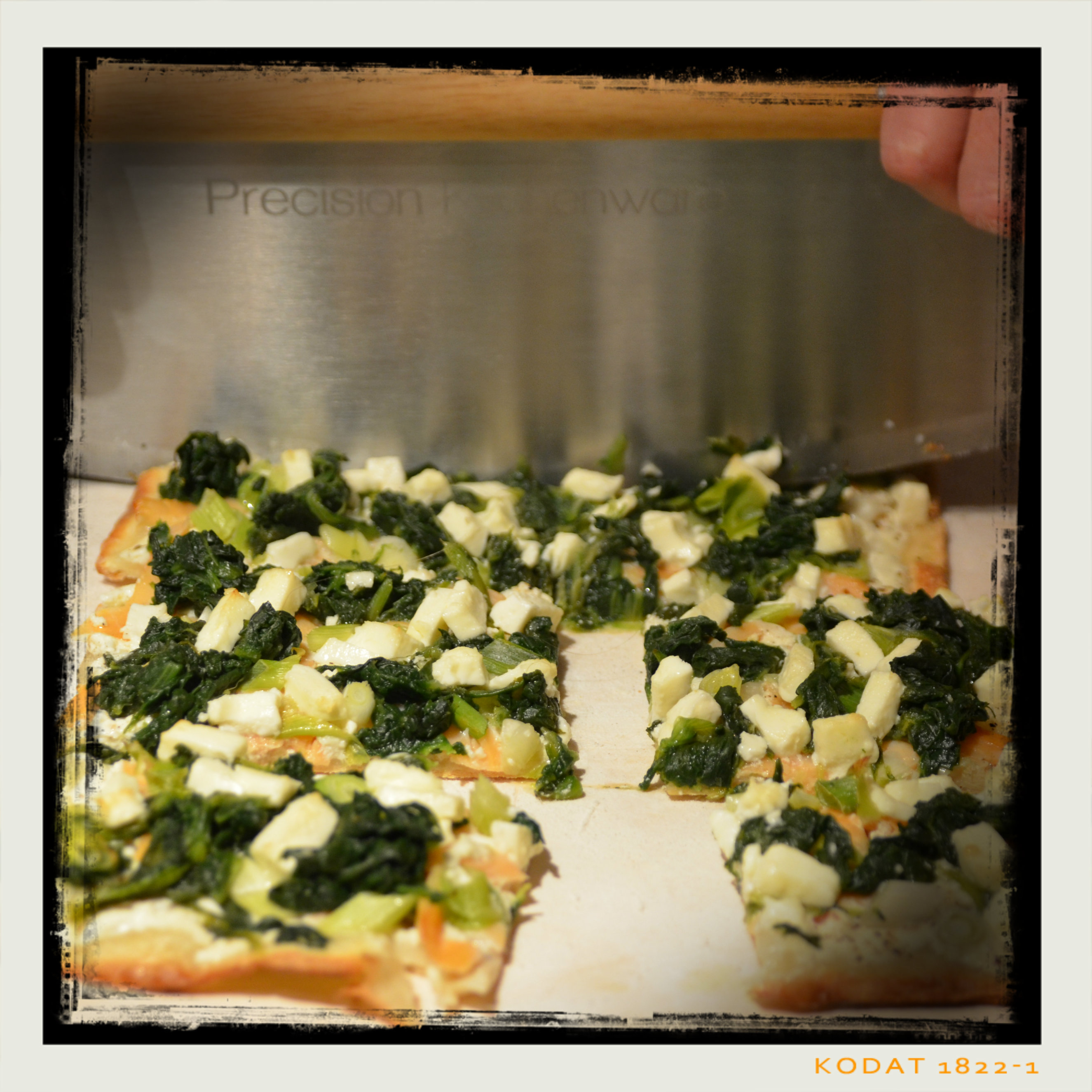 den Flammkuchen auf den Stein gleiten lassen und ca. 9 Min. backen (alternativ auf Backpapier ca. 15 Min.)