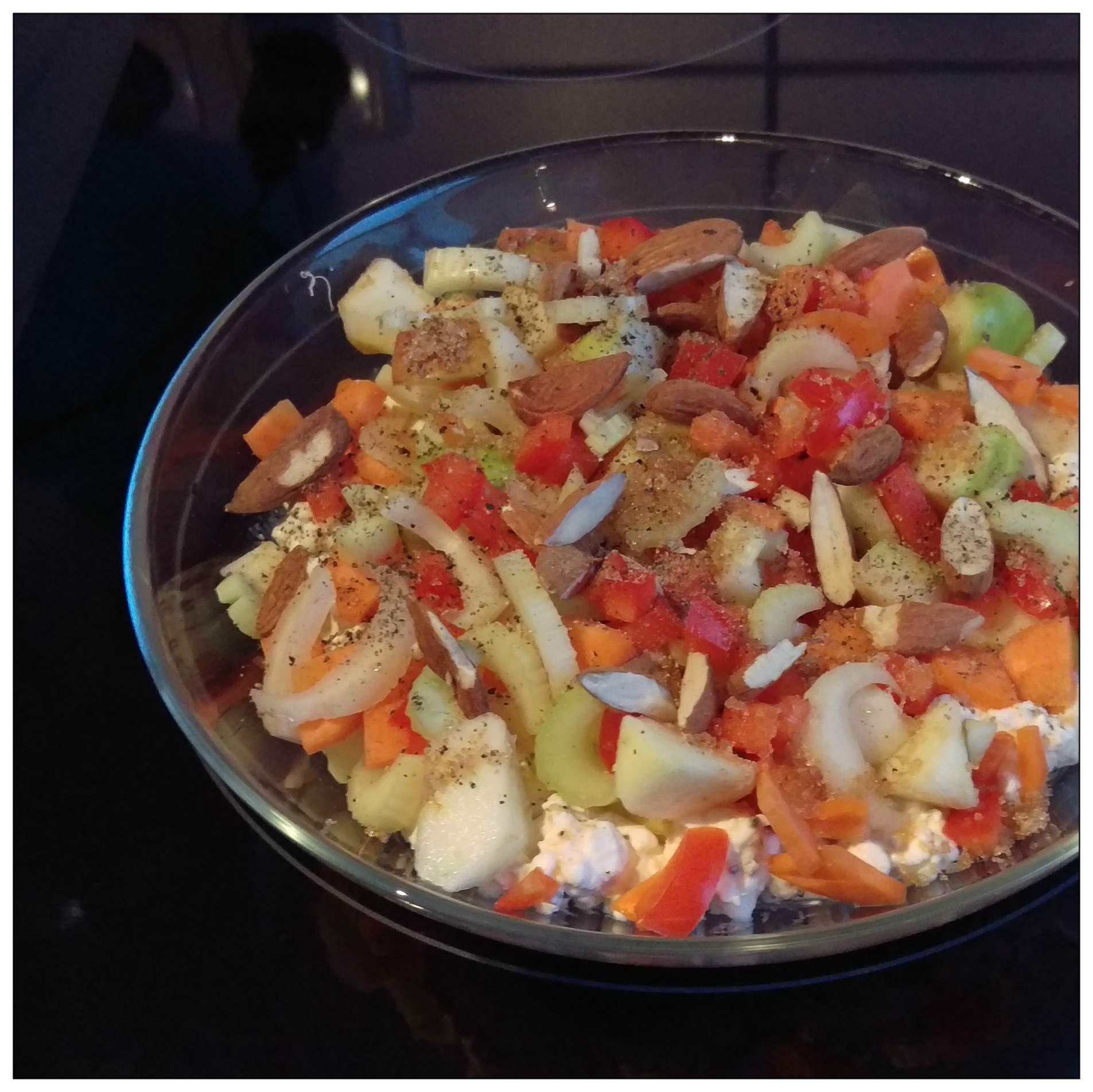 1 kl. Stange Staudensellerie in dünne Scheiben schneiden und auf den Hüttenkäse geben, dann mit