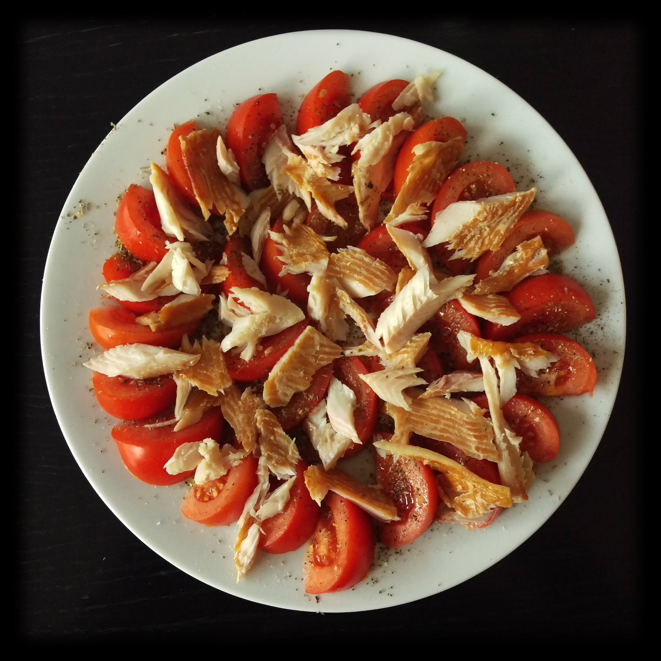 die Forellenfilets in mundgerechte Stücke zerteilen und auf den Tomaten verteilen