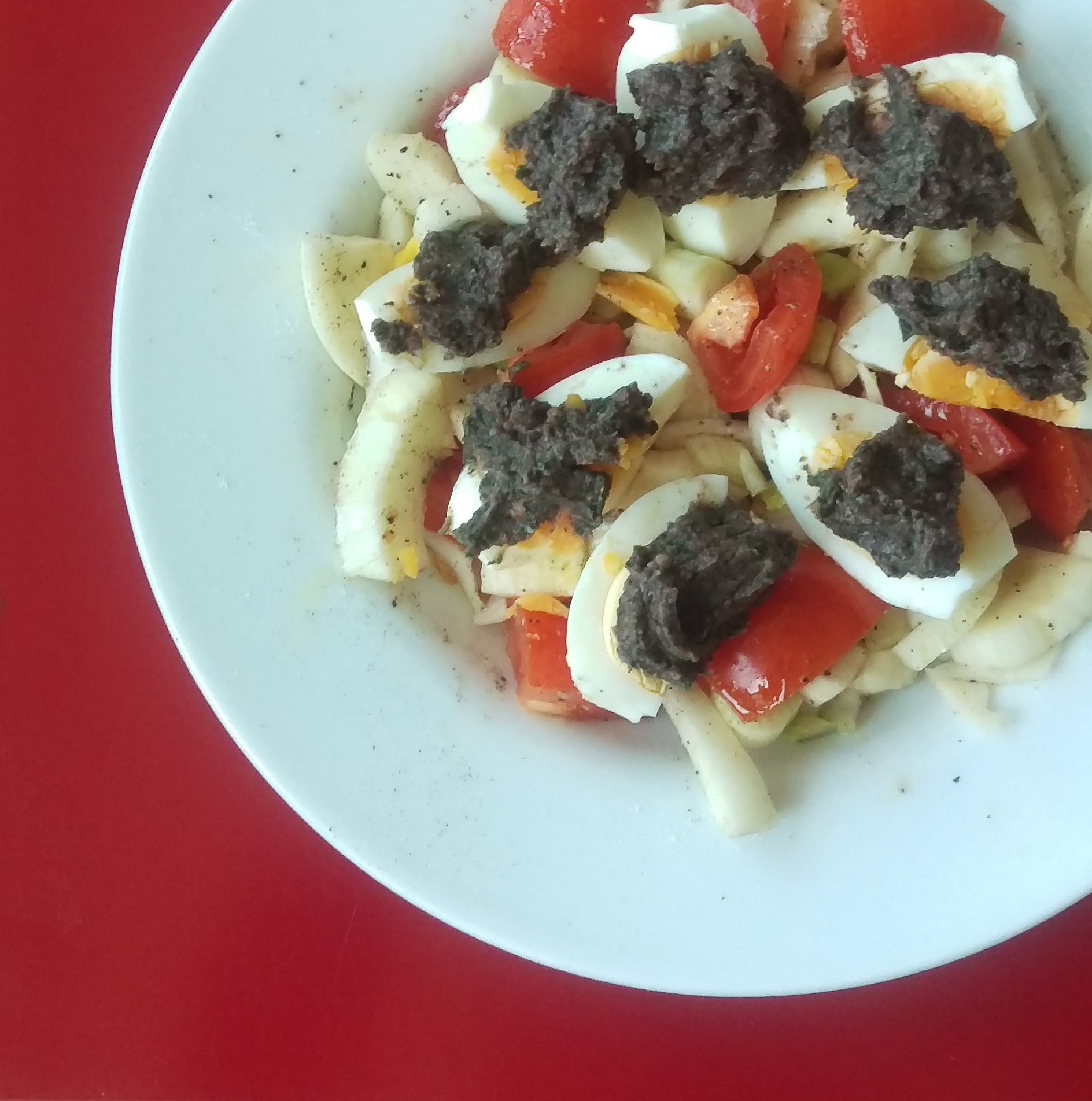 frisch gemahlenem schwarzen Pfeffer zu einem Salat mischen, dann die beiden Eier längs vierteln, auf dem Salat verteilen und mit