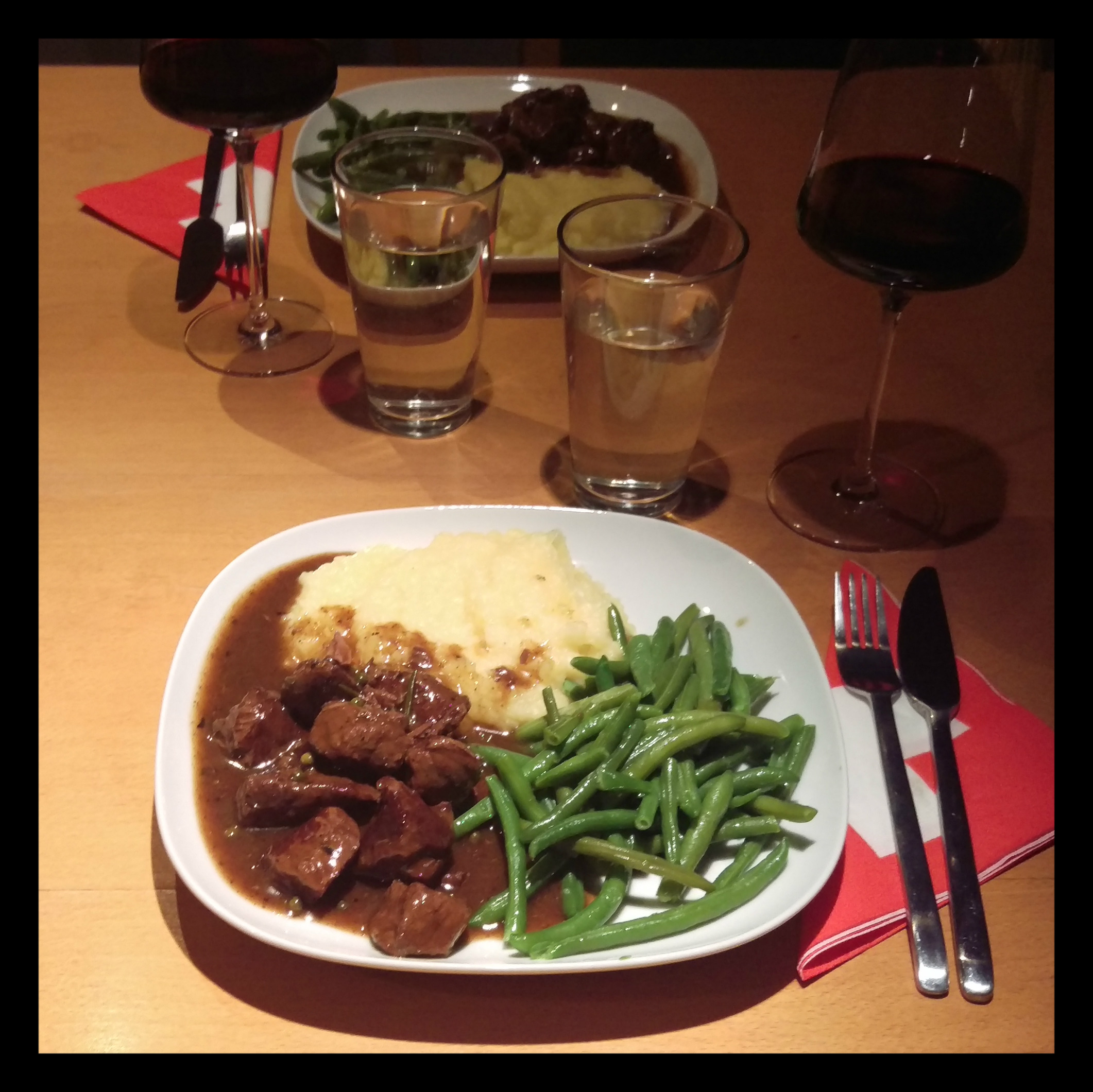 250 ml trockenen Rotwein dazugeben, etwa eine halbe Stunde vor Ende der Garzeit